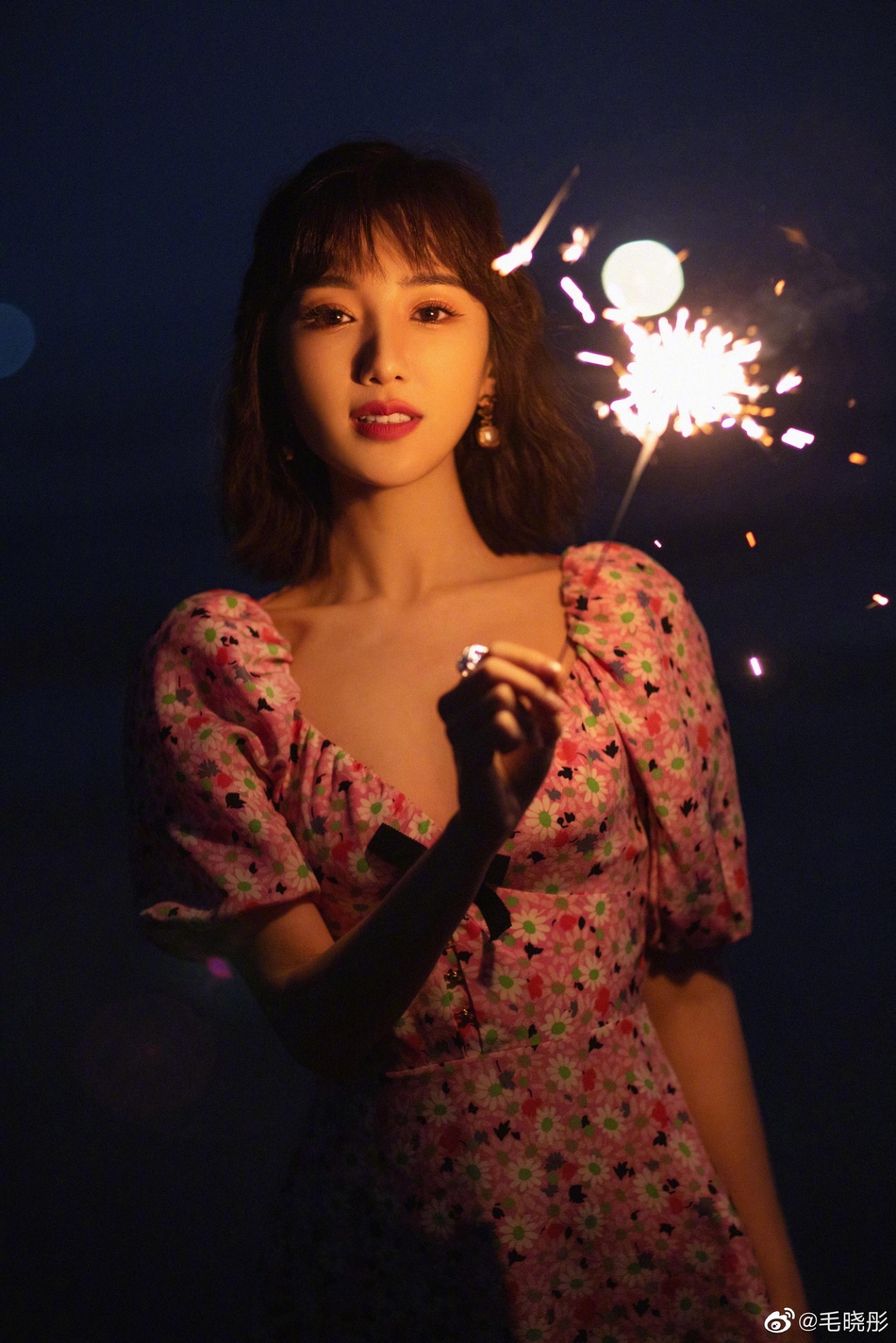 2月26日,毛晓彤身穿碎花短拳在海边玩烟花棒,对镜甜美微笑,少女感十足。