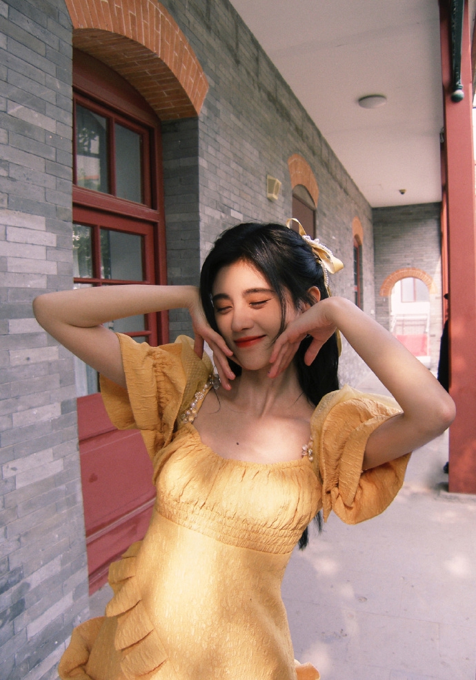 5月4日,鞠婧祎工作室曝光18宫格美图,图中的鞠婧祎身穿珍珠点缀黄色泡泡袖连衣裙,可爱元气满满,半扎公主头温柔又优雅。