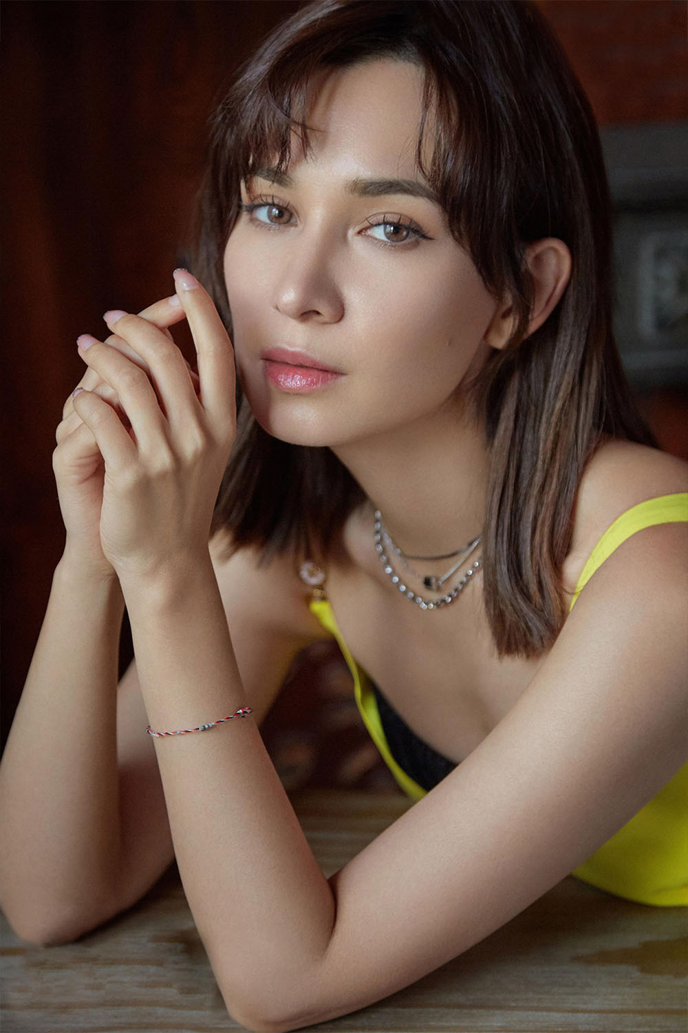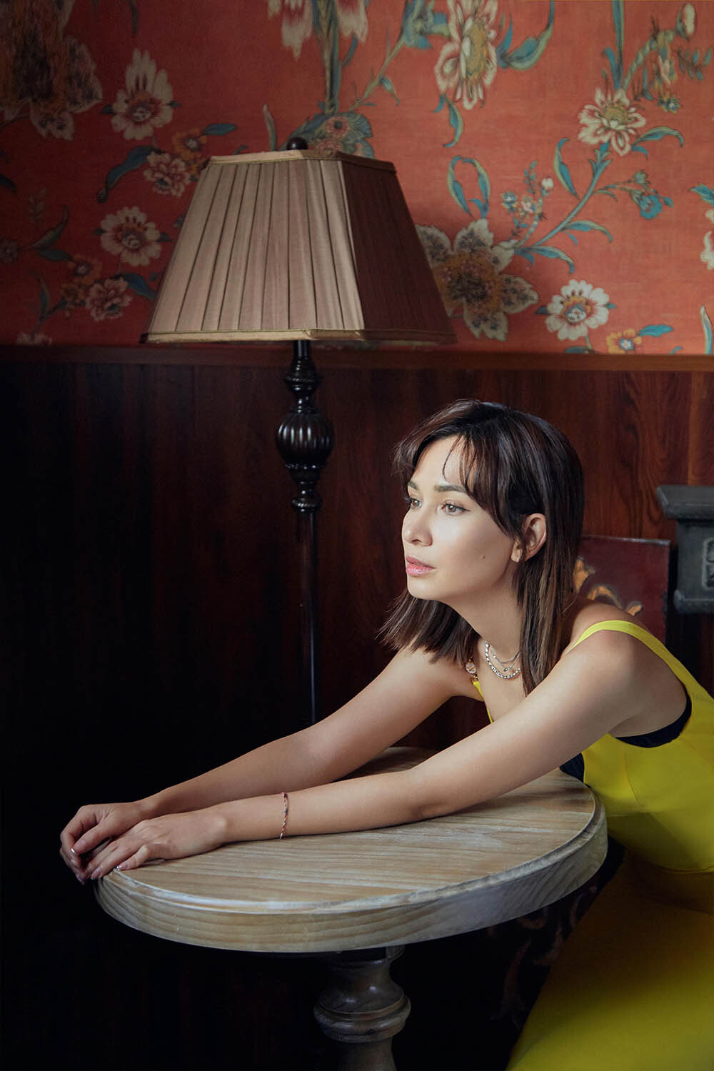 最新释出的大片中,卢靖姗身穿一袭明黄色鱼尾吊带裙,张扬的荷叶边活泼俏皮,散落的秀发随性别在耳后,温柔又不失大气。实木圆桌与复古红的壁纸相互映衬,卢靖姗慵懒的依靠在半开的百叶窗前,俯仰之间,演绎摩登情调。