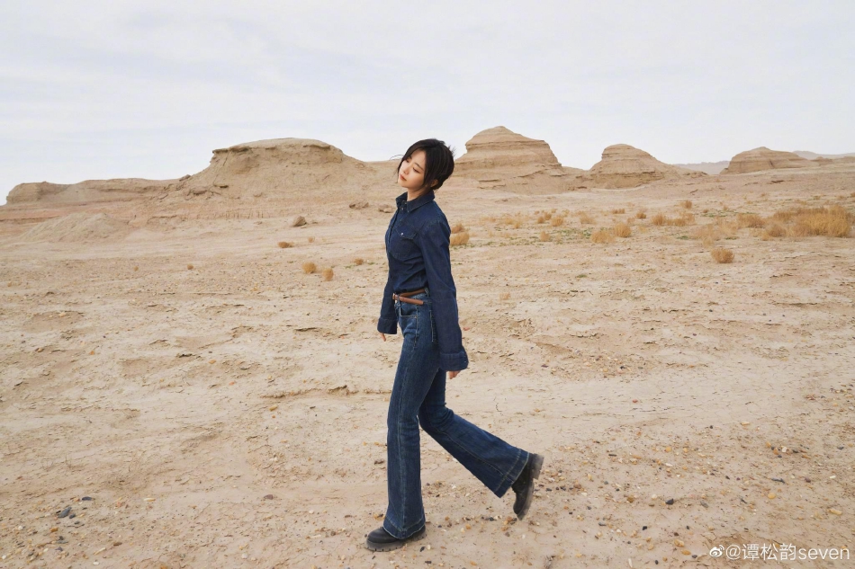 4月18日,谭松韵在微博晒出一组沙漠氛围感大片。照片中,她身穿深蓝色牛仔套装,戴着墨镜,刘海随风飘扬,个性十足。