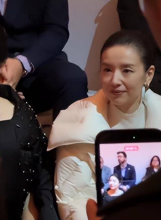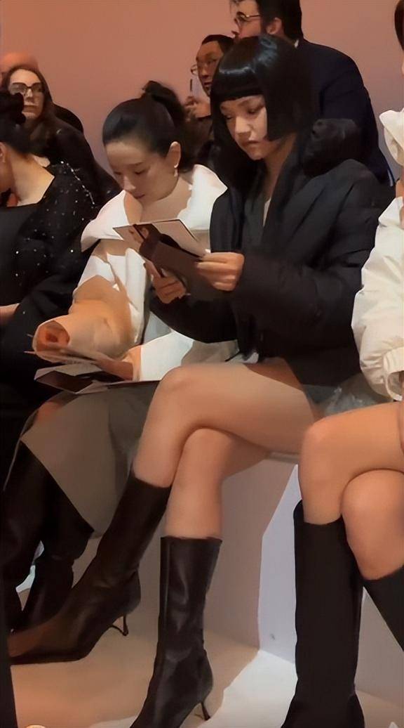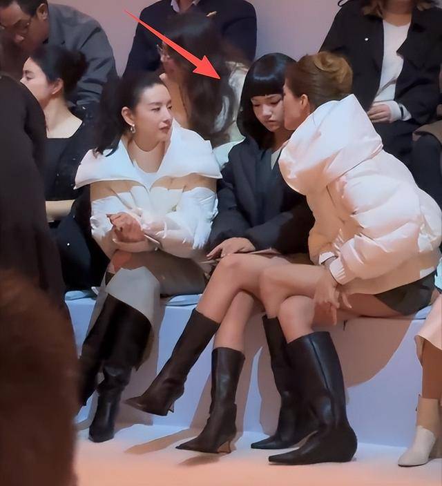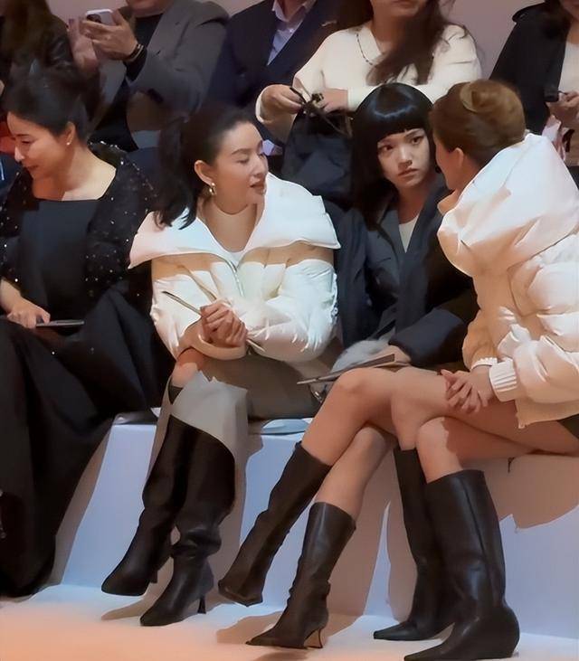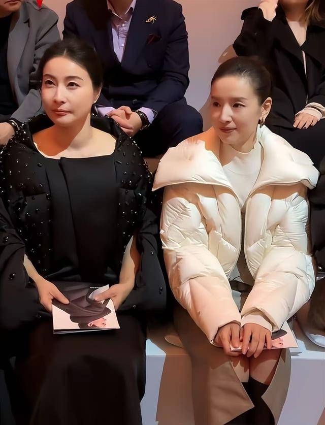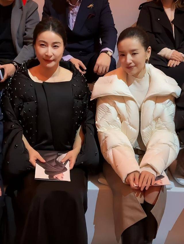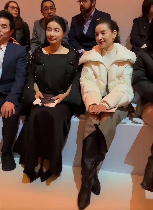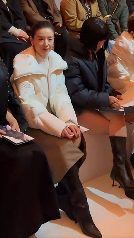 低调端庄的阔太风范:身穿黑色镶钻羽绒服搭配真丝裙,与波司登老板同坐首排,气质贵气沉稳。但全程话少,仅与董洁简短交流。