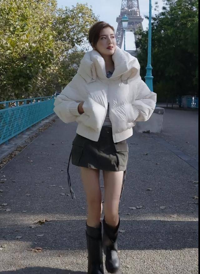 精修图:白色羽绒服搭配皮靴、黑色短款羽绒服配百褶裙等造型获赞"简约时髦",展现优越骨相。