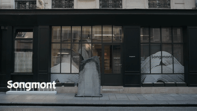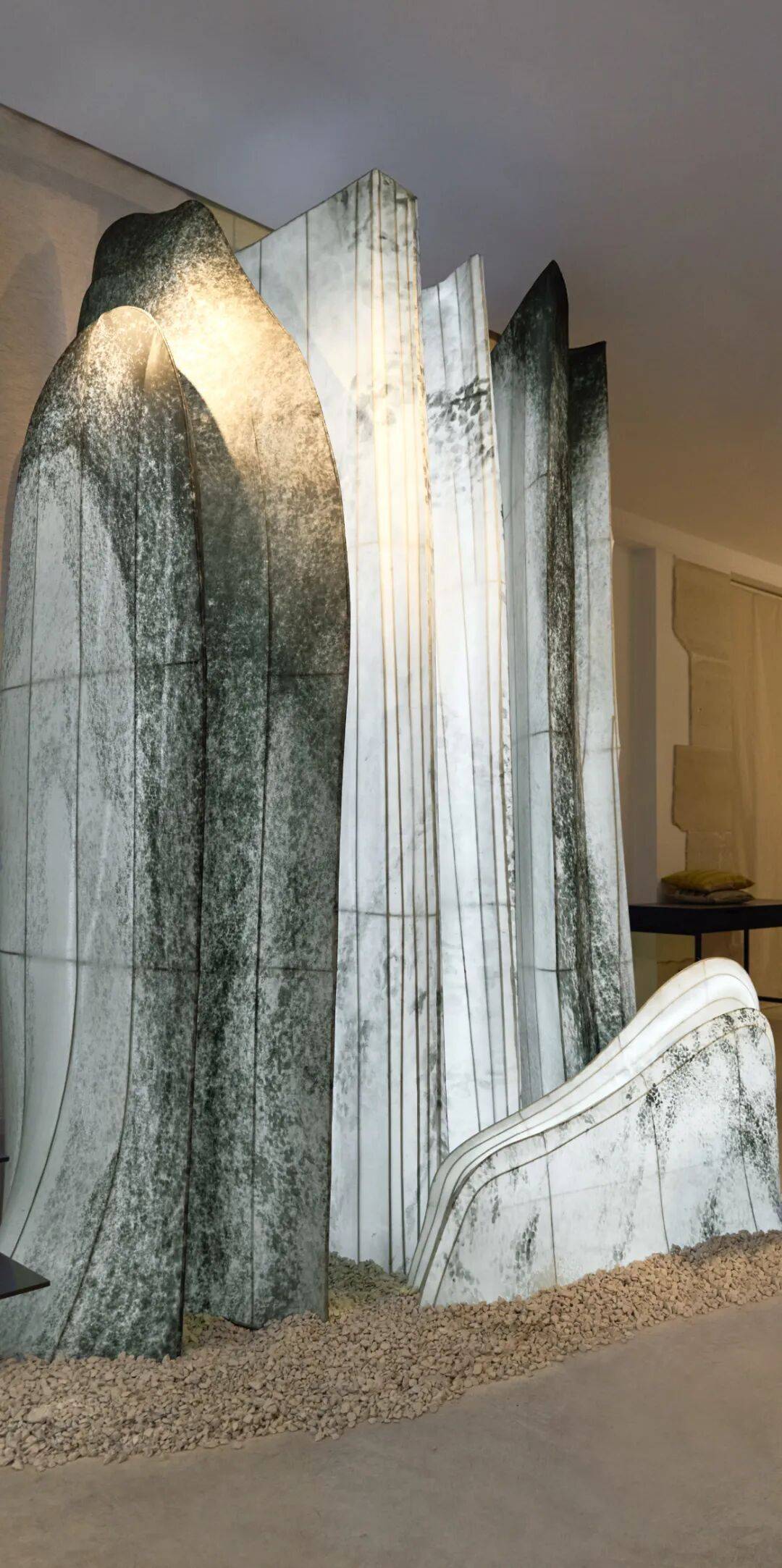 展览入口处,来宾们第一眼看到的,就是一颗山石,与橱窗上起伏的山峦,和Songmont的标志一起,告诉你即将走入一场“远山有声” (Song of Mont)的文化体验之中。