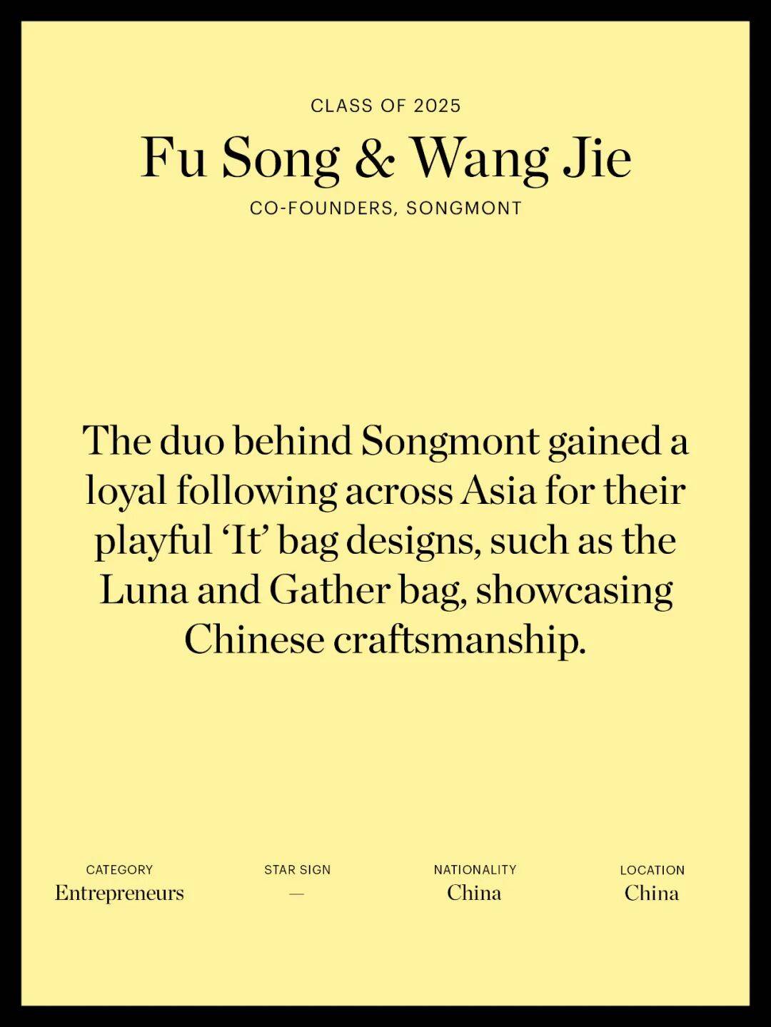 BoF 500介绍他们说:“山下有松背后的双人组合凭借其有趣的‘IT Bag’设计,在亚洲赢得了忠实的追随者,这些设计彰显了中国的工艺”。