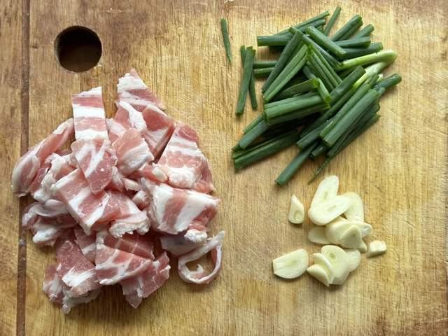 1、准备一块五花肉切成薄片备用、大葱切段、大蒜切片备用;