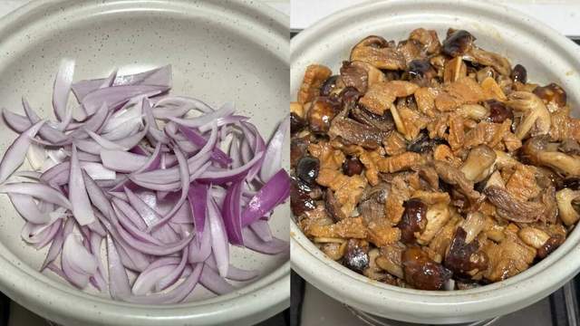 5、砂锅里铺半个洋葱丝,再把炒好的蘑菇、五花肉加进去,焖上1-2分钟收收汁;