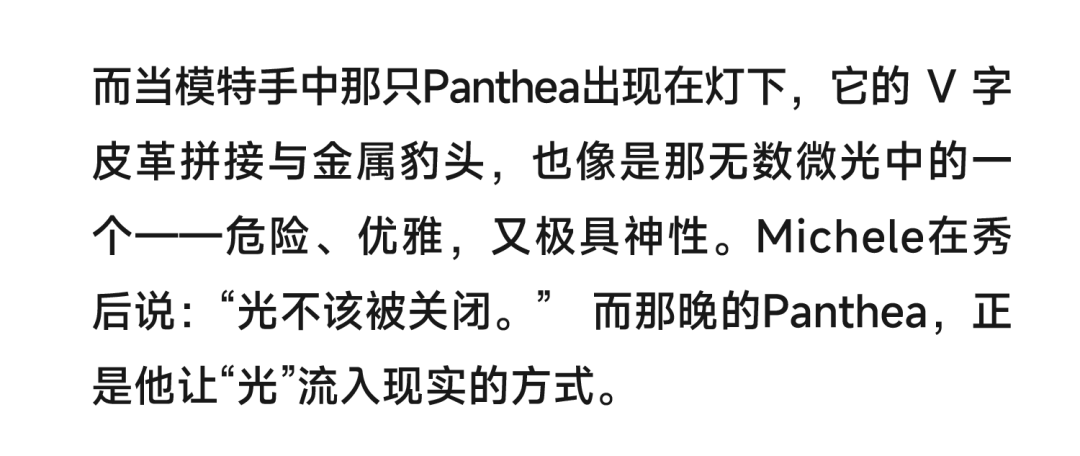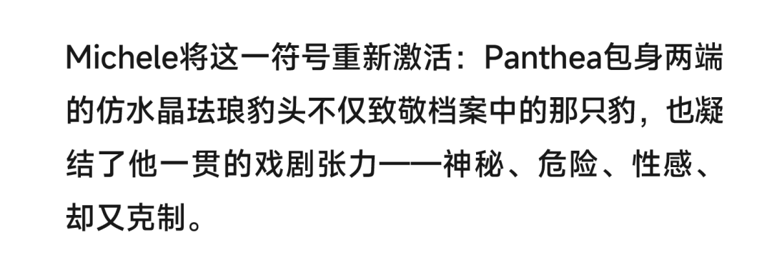 品牌创意总监Alessandro Michele强调:"Panthea不是配饰,而是情绪连接的纽带",将其升华为自信与自我认同的图腾
