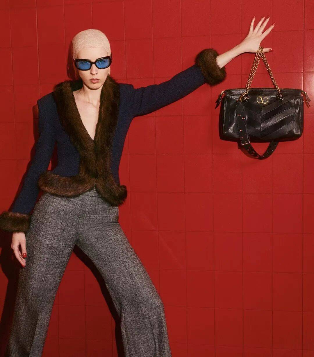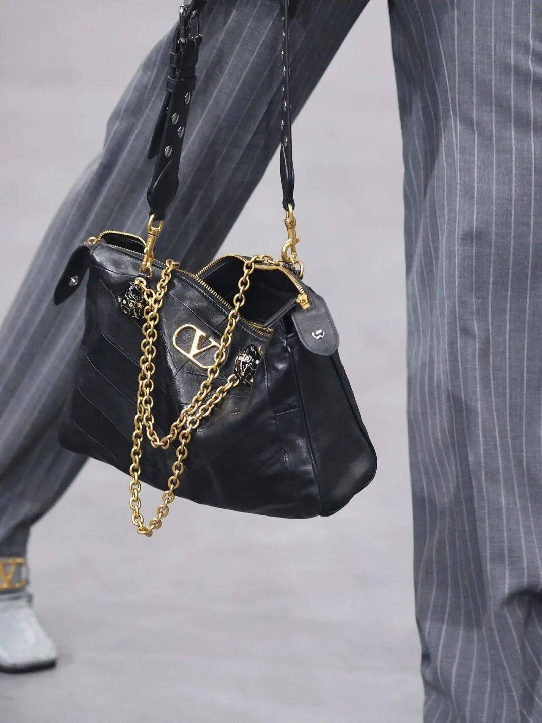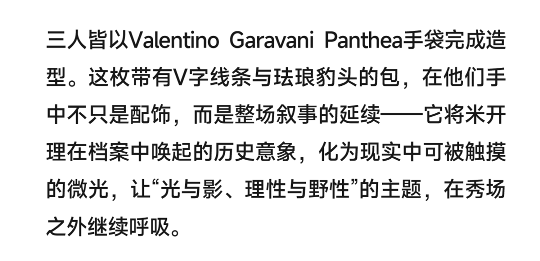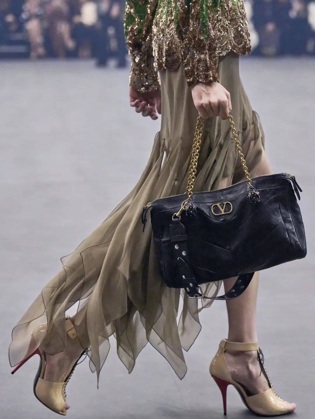 Panthea顶部的三维立体V字金属标识,延续了品牌1960年代的基因。这一设计源自Valentino先生为杰奎琳·肯尼迪定制礼服时的低调标识,如今被放大为权力与逆袭的象征。雕塑感结构与开口设计,隐喻"突破桎梏,向上托举"的精神内核。