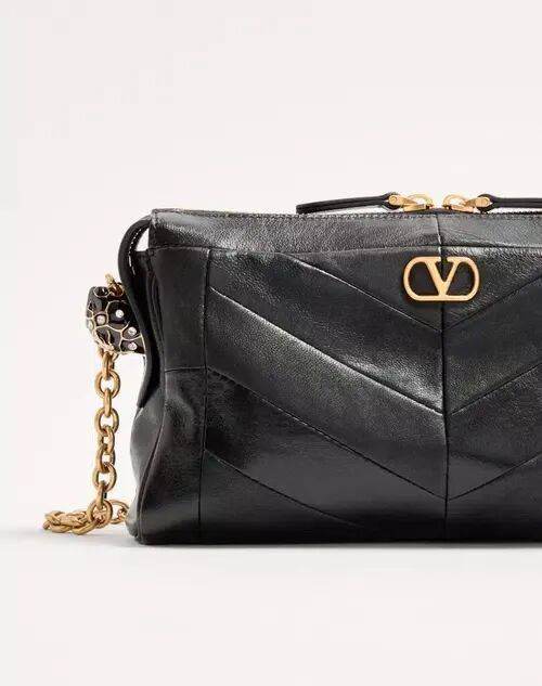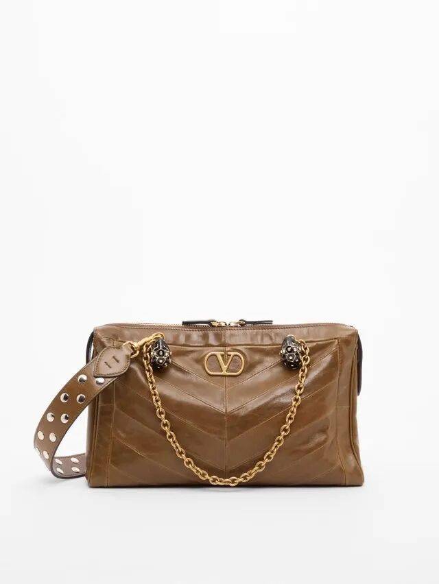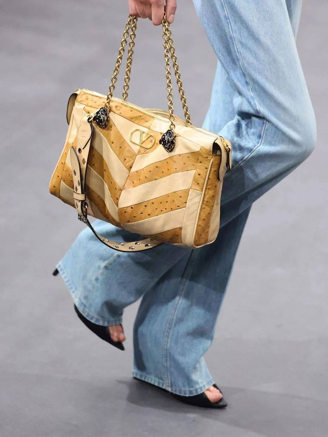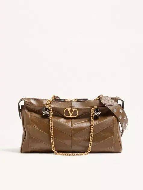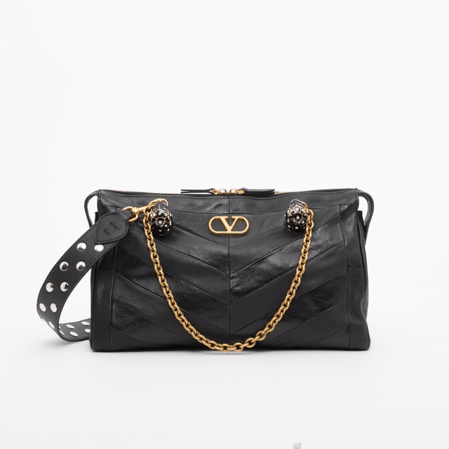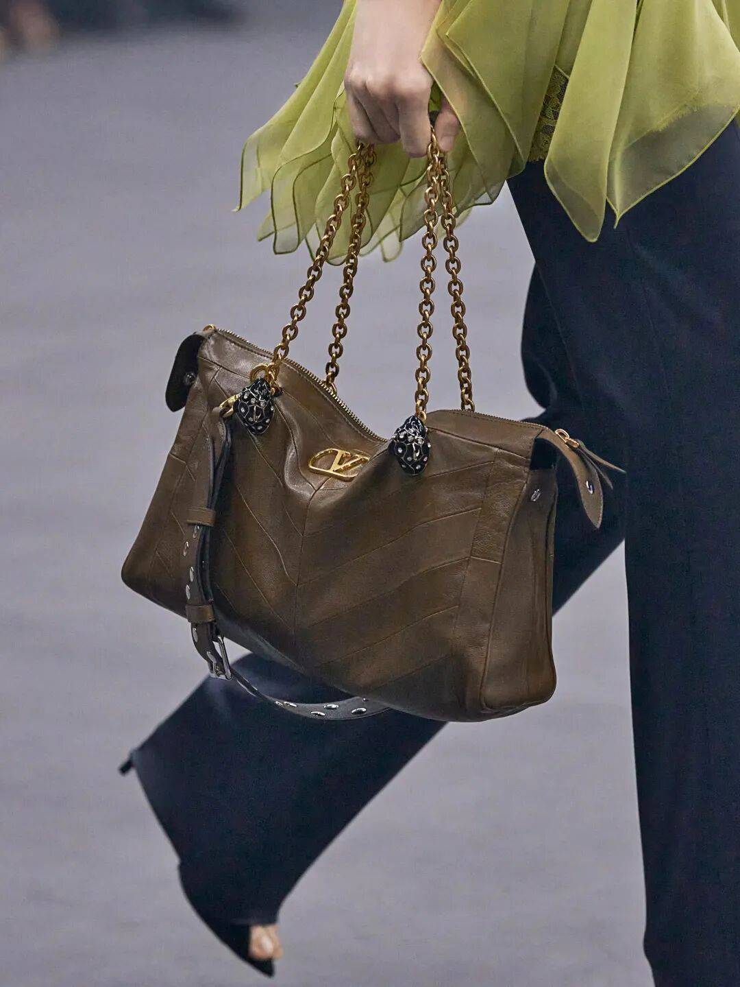 Panthea顶部的三维立体V字金属标识,延续了品牌1960年代的基因。这一设计源自Valentino先生为杰奎琳·肯尼迪定制礼服时的低调标识,如今被放大为权力与逆袭的象征。雕塑感结构与开口设计,隐喻"突破桎梏,向上托举"的精神内核。