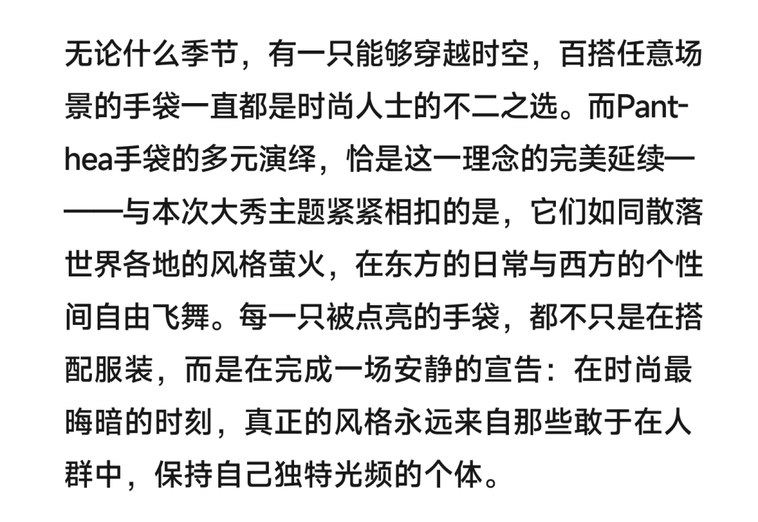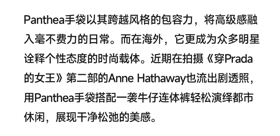 安妮·海瑟薇(《穿Prada的女王》主演)戏外与Panthea的绑定,延续了"安迪逆袭"的叙事。从被改造的助理到掌控资源的精英,Panthea成为职场蜕变的物质见证。
