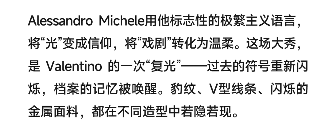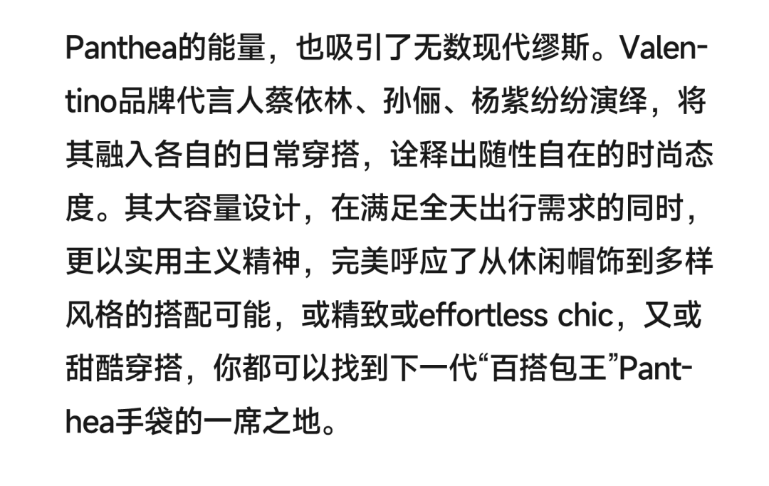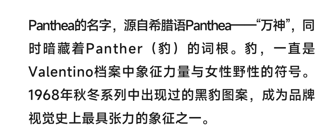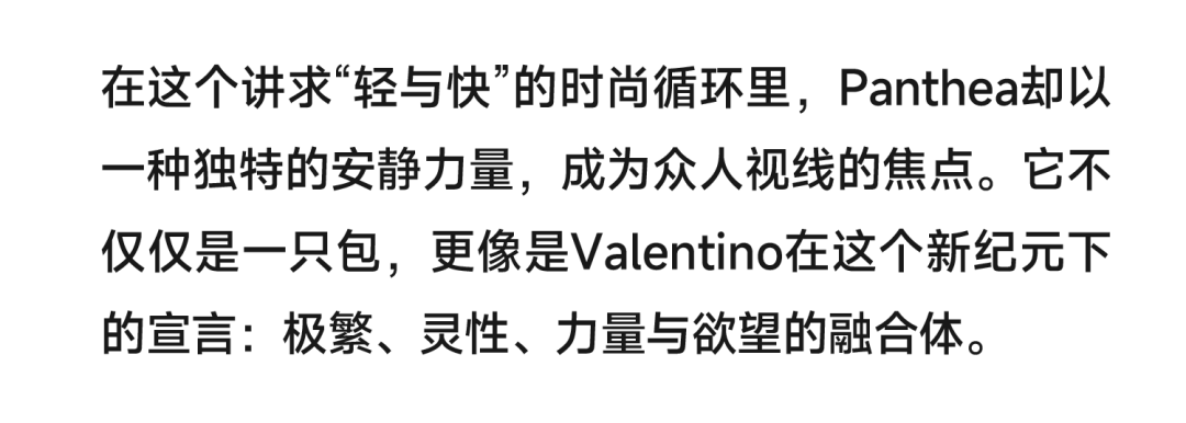 Panthea的成功源于Valentino对历史符号的创造性转化(V字→胜利宣言,黑豹→野性力量),以及精准的时代情绪捕捉(职场逆袭叙事、长期主义价值观)。它不仅是手袋,更成为当代女性重塑自我权威的"武器"与"勋章",最终完成从配饰到文化符号的跃迁。