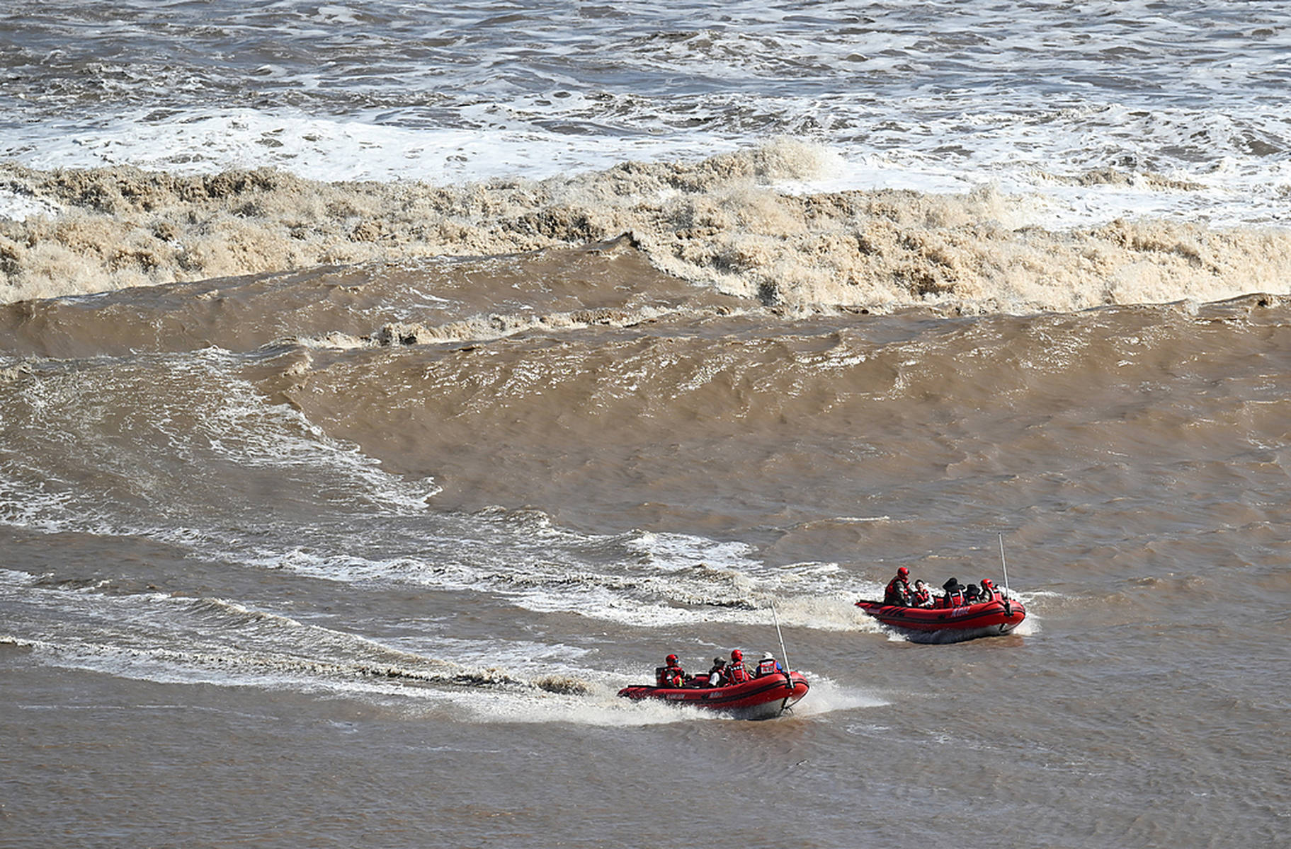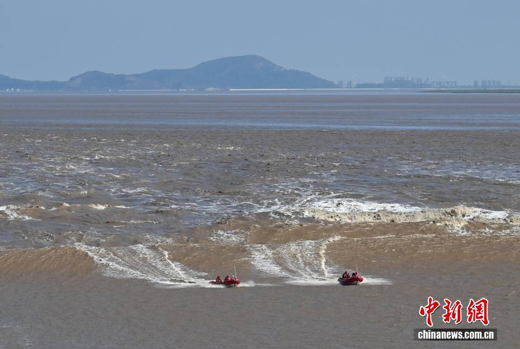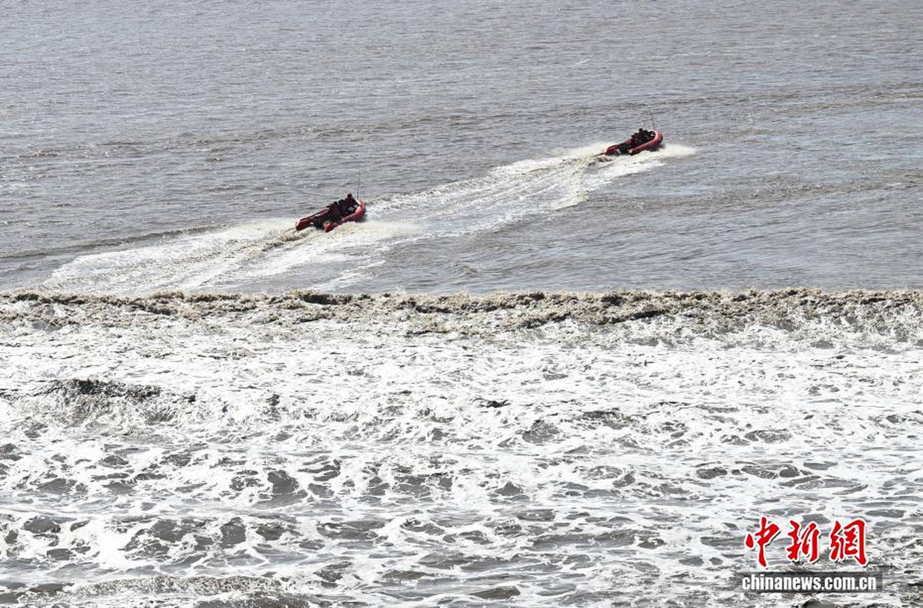 2025年10月9日,两艘快艇在钱塘江大潮的潮头前行驶。中新社记者 王刚 摄