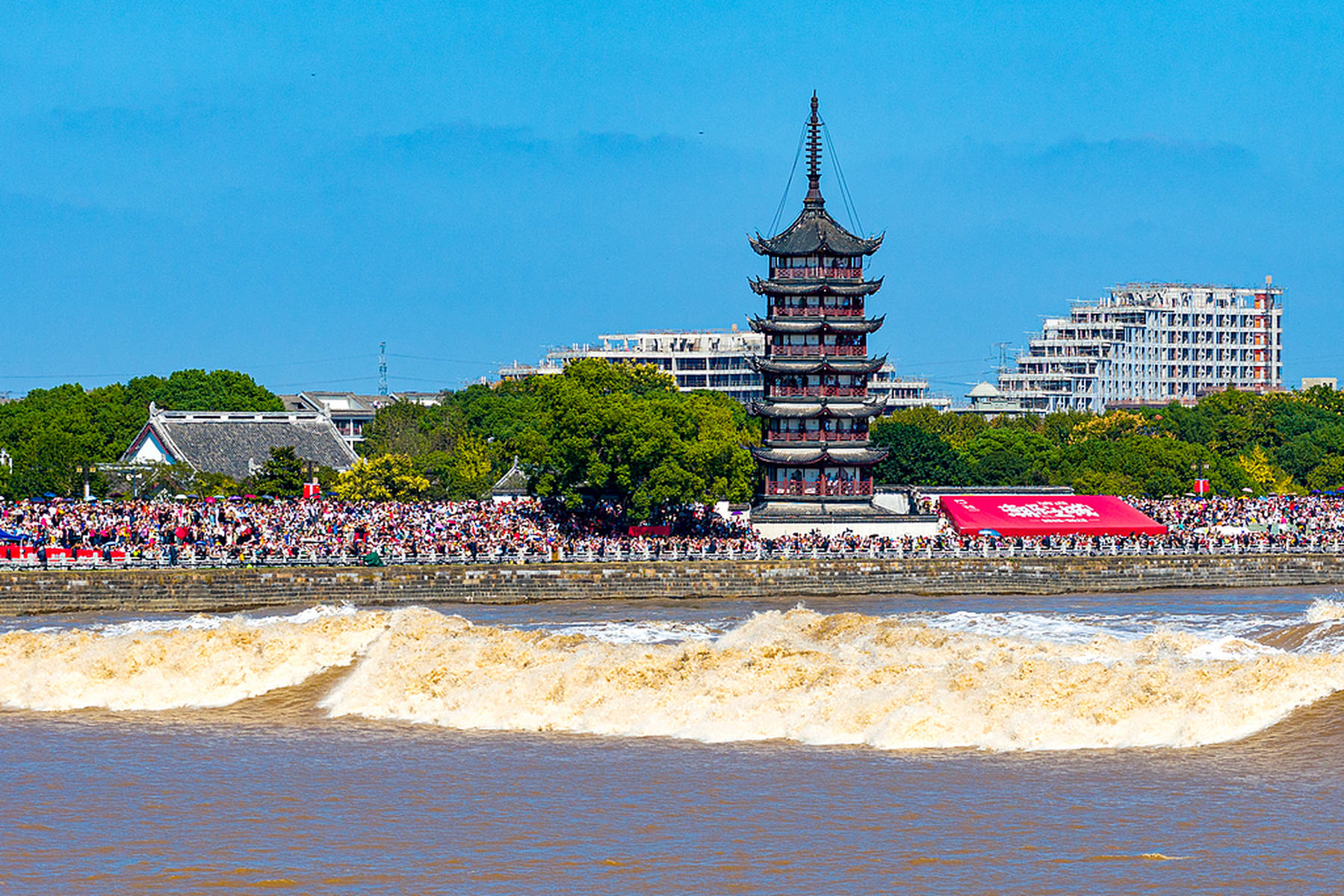 恰逢国庆中秋长假,海宁盐官的“一线潮”、老盐仓的“回头潮”等观潮点都呈现出各具特色的涌潮景观,大量游客前来观潮、游玩。尽管部分区域因海塘安澜工程实施管控,游客们在工作人员引导下有序观潮,在确保安全的前提下共同欣赏这场自然奇观。
