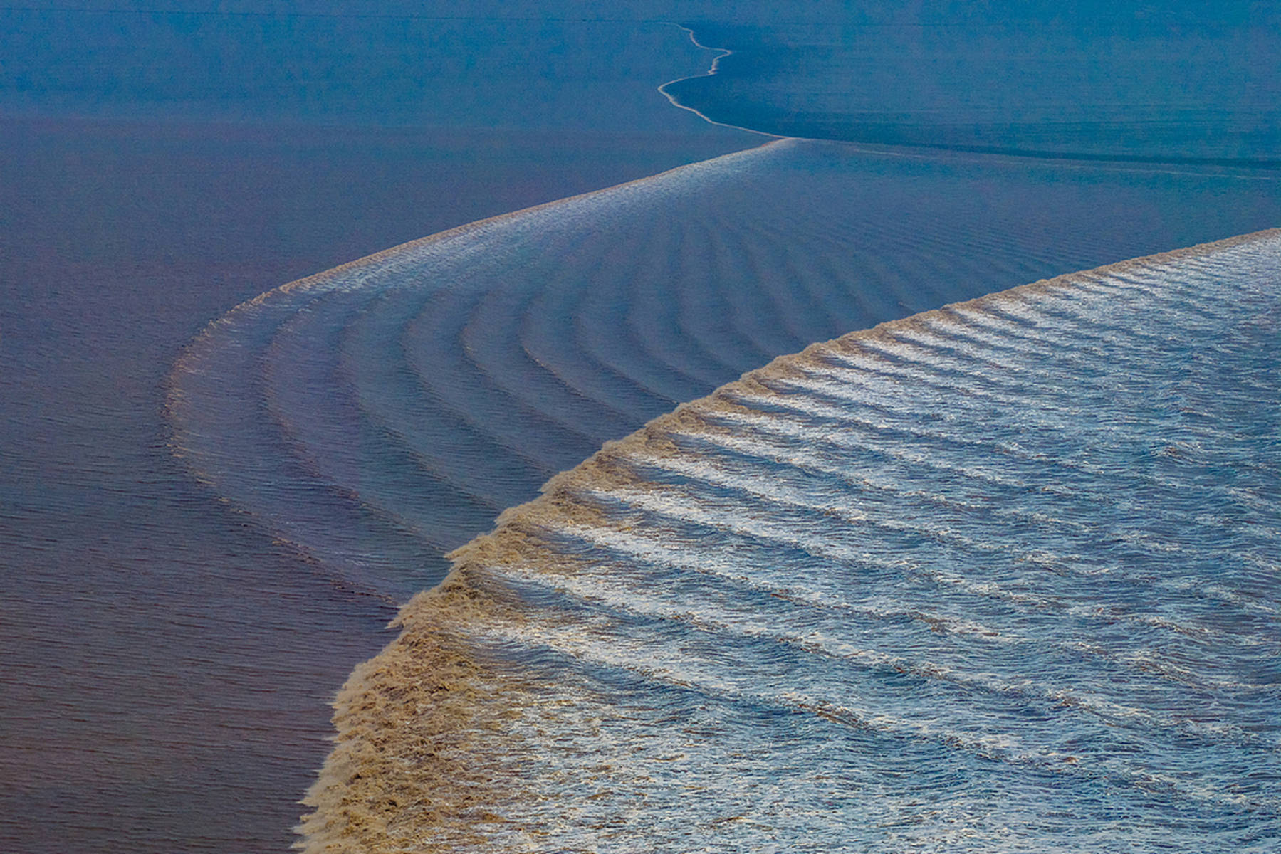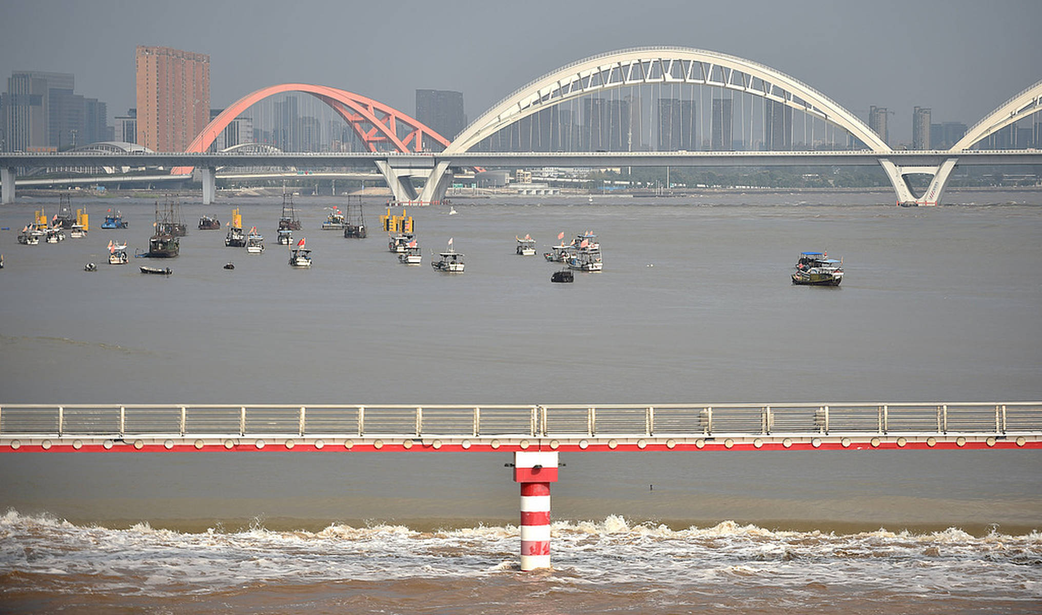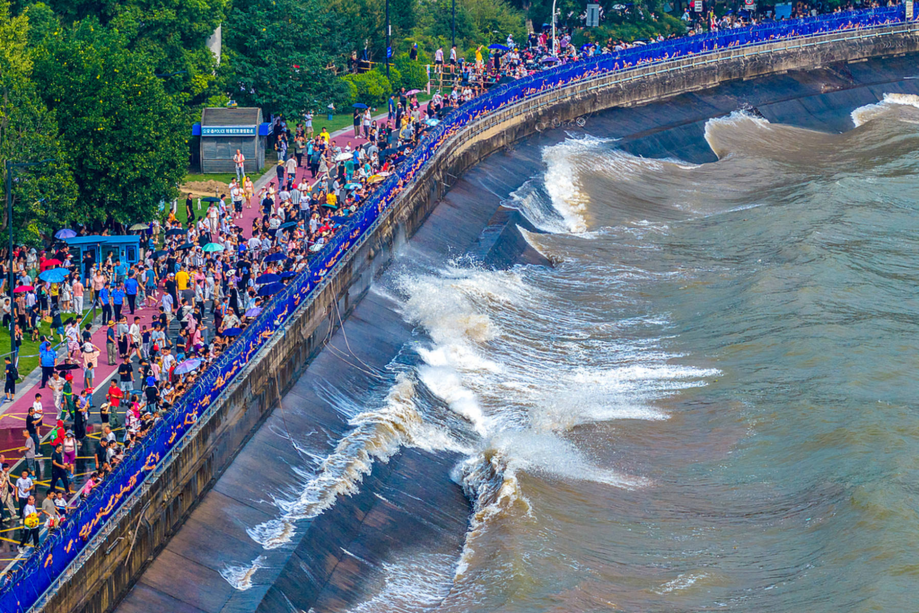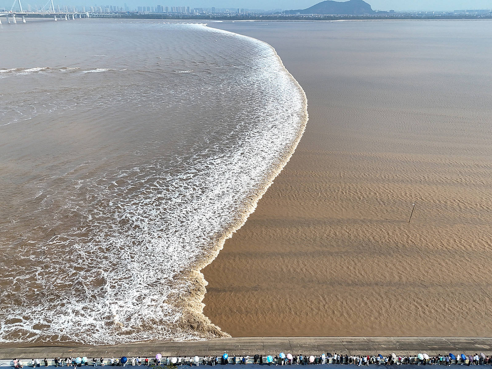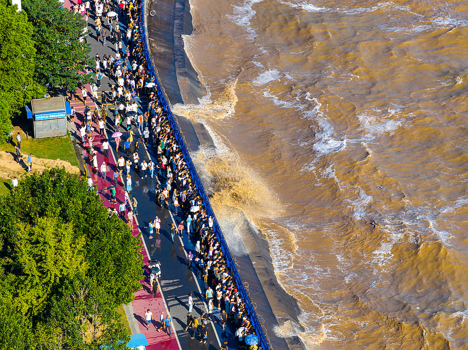 10月9日,钱塘江大潮向上游奔涌。当日是农历八月十八,钱塘江迎来大潮汛,在浙江嘉兴海宁盐官,众多游客争睹“八月十八潮”,感受钱塘江大潮的汹涌壮观。