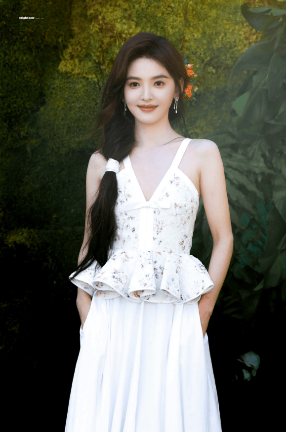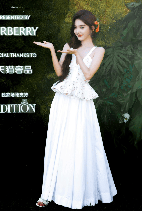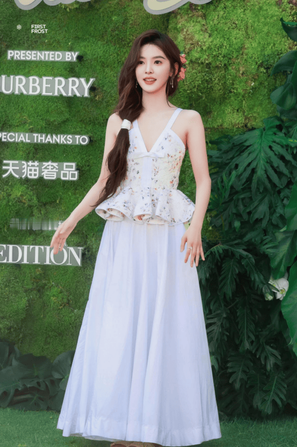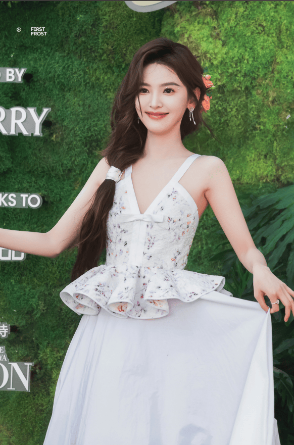 章若楠这次的造型太让人惊艳了!她穿着一条带有碎花元素的白色吊带裙,吊带的设计简约又大方,完美地露出了她纤细的肩颈线条。裙子上的碎花图案精致又清新,给整体造型增添了不少柔美气息。