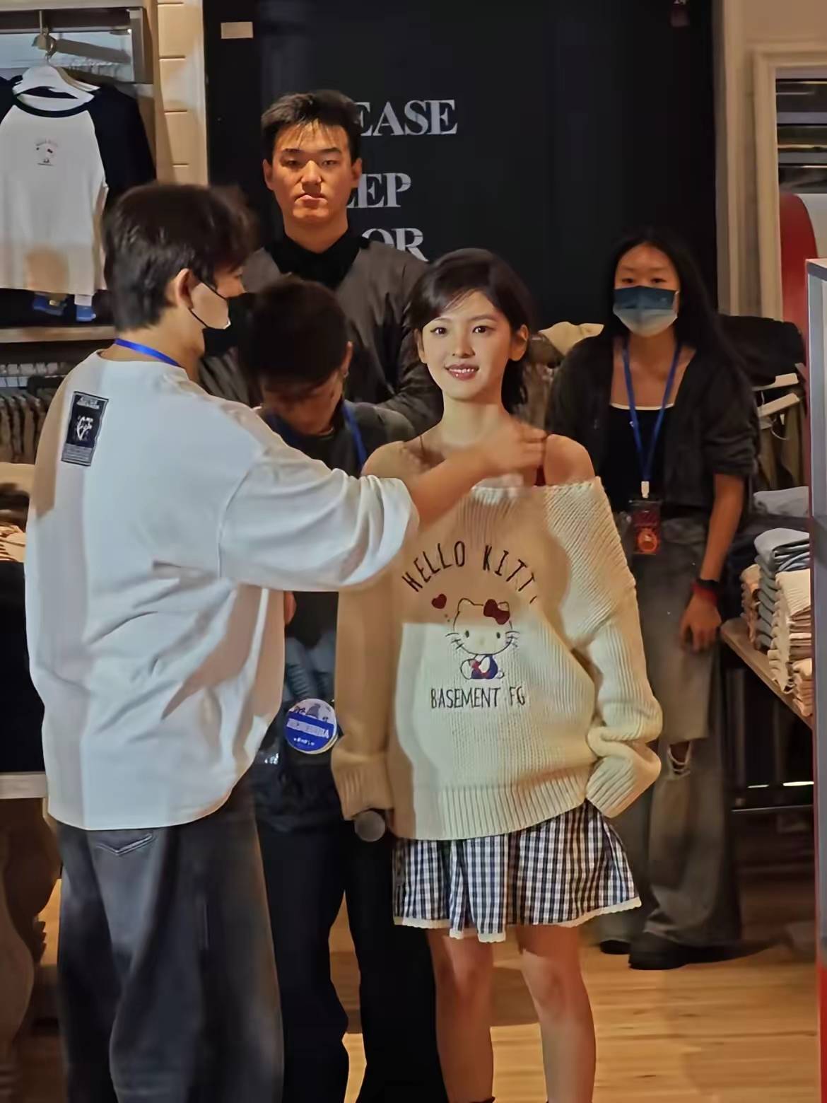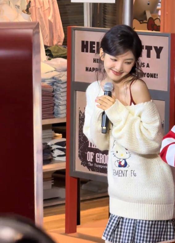 她的长发随意散落,肤色细腻白皙,仿佛自带光泽。当天她选择了一件清新可爱的上衣,搭配格子短裙,肩头若隐若现,更加衬托出青春甜美的气质。章若楠模仿身旁卡通人偶摆出各种可爱动作,在别人身上可能显得刻意,但由她演绎出来却毫无违和感。