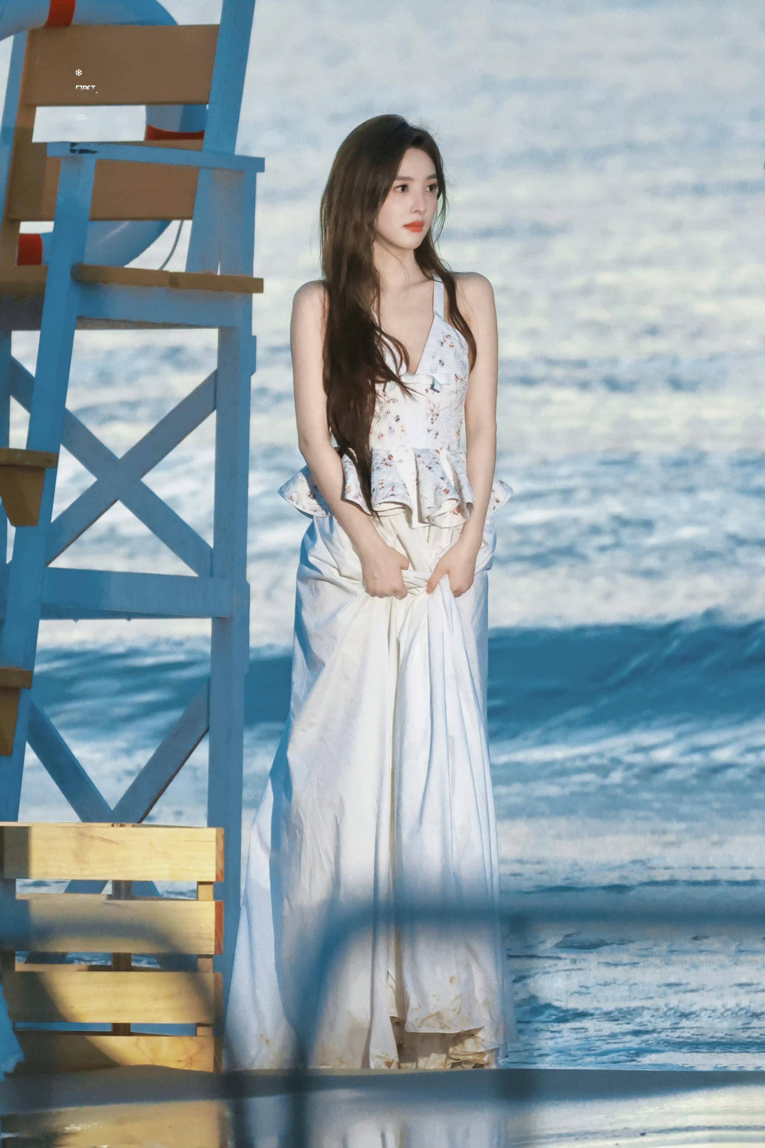 裙摆部分是大大的白色裙摆,她在海边时,轻轻提着裙摆,赤脚踩在沙滩与海水中,画面特别唯美。要知道章若楠是 1996 年出生的,今年才 29 岁,正是青春靓丽的时候,这样的造型特别符合她的年纪,充满了少女感。而且她的身材属于比较骨感的类型,穿上这种性感又带有清新感的吊带裙,不会显得过于丰满,反而有种别样的纤细美,就像从童话里走出来的仙女一样。