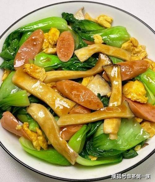 食材:杏鲍菇、香肠、鸡蛋、油菜、生蚝、酱油。