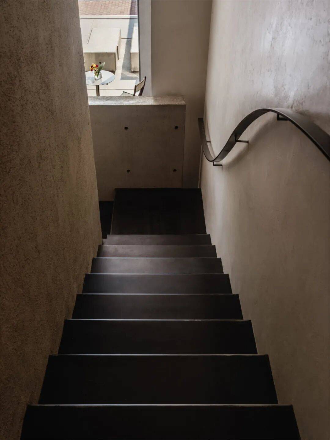 钢制的深色阶梯是通往上楼的路径,只需一条铁链轻轻拦住,悬浮于空气之中,不做绝对的阻隔,而是暗示着一步之遥的界限。它既坚固又随意,在无声之中,与空间的冷静形成微妙的张力。
