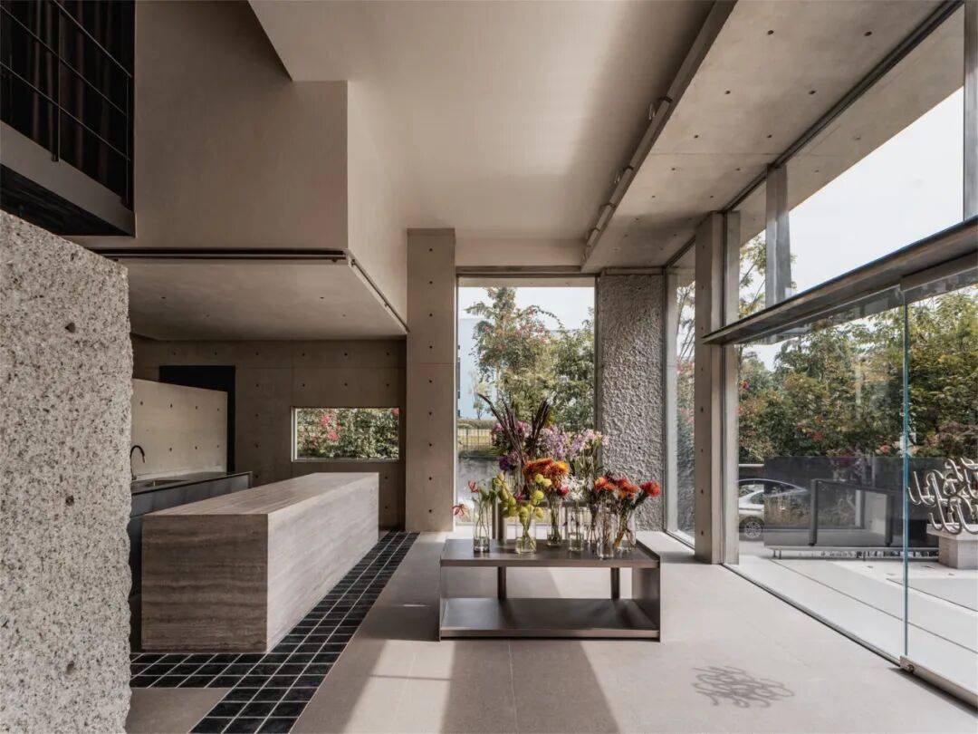 通透的玻璃幕墙,如湖面般沉静,映照着花的影子,也倒映着远方的天空。它隔离了内外,却不阻断视线,让空间保持通透,使阳光成为无形的构造,赋予混凝土以轻盈之感。在这方寸之间,流动的不止是光,还有风的低语、时间的痕迹。