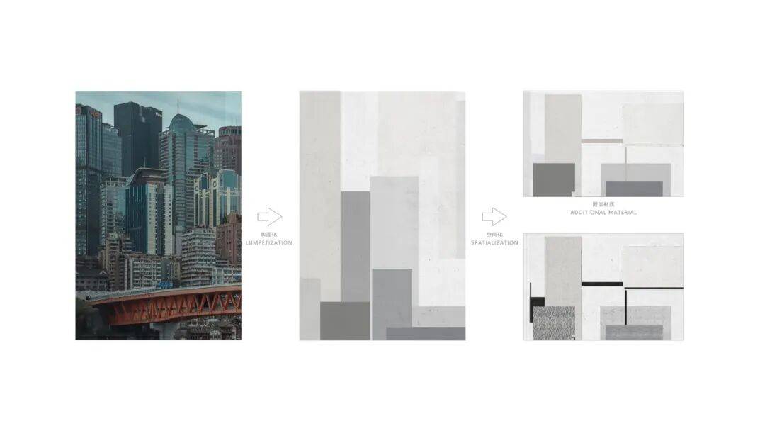 重庆的城市肌理以其山地地形为特色,密集叠加的高楼形成层层递进、纵深有致的天际线。设计师将这一独特景观抽象为几何语言,通过材质板片的交错堆叠,重构出前景、中景与远景的秩序。