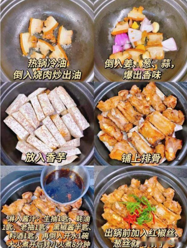 特点:排骨的鲜美汤汁渗透到芋头中,使得芋头更加香浓入味。黑椒酱增添了独特的风味。用砂锅煲制更能锁住香味。