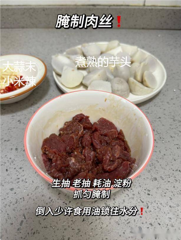 材料:适量芋头,适量牛肉,大蒜末,小米辣,老抽,蚝油,辣椒面,少许盐,鸡精,玉米淀粉。