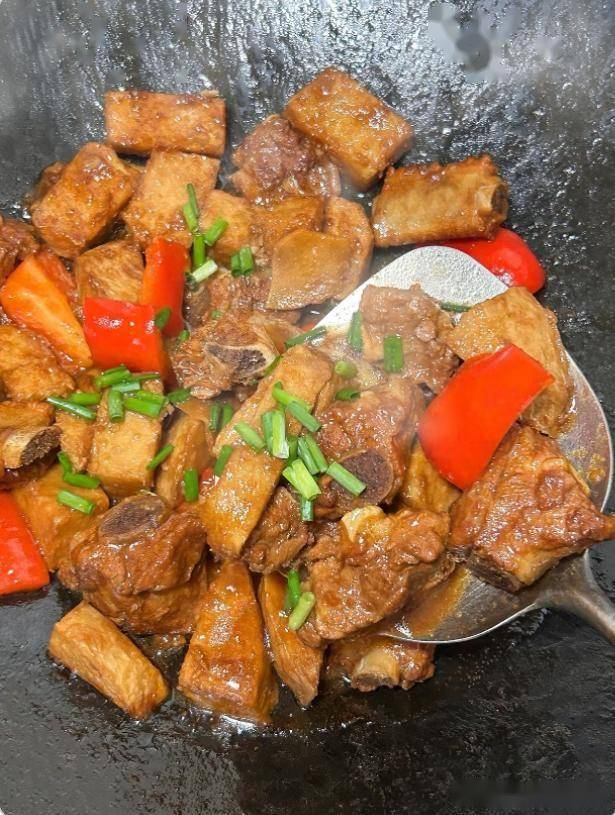 6. 加入芋头块和红椒块继续炖煮20-25分钟。