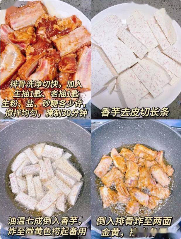 材料:适量排骨,适量芋头,生抽,老抽,玉米淀粉,盐,白糖,生姜,葱蒜,黑椒酱。