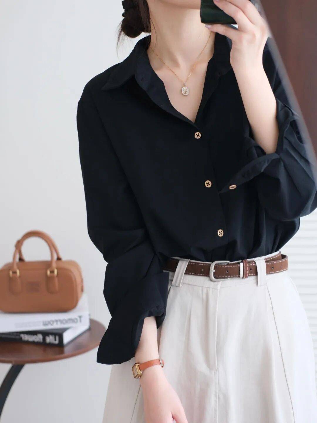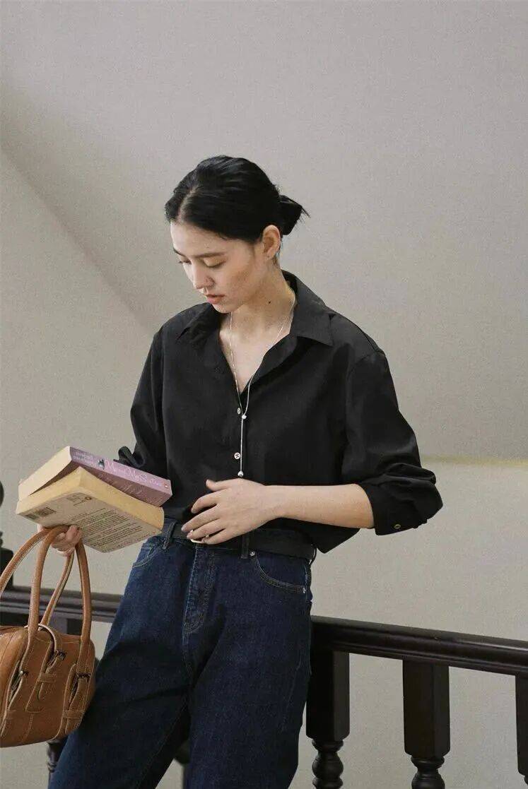 解开两粒扣子,让脖子看起来更加修长,还能隐约露出精致的锁骨,增添几分小性感。