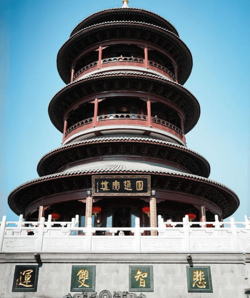 圆通宝坛是寺庙内极具特色的建筑,高43.6米,汉白玉栏杆衬托下更显恢宏。其设计融合了北京天坛的恢弘气魄与江南园林的精秀细腻,坛内分层供奉毗卢观音、千尊观音圣像及正法明如来。站在宝坛之上俯瞰,整个寺庙的格局尽收眼底,宛如一座气派的皇宫。手扶护栏举目远望,能感受到强烈的视觉震撼和心灵涤荡。