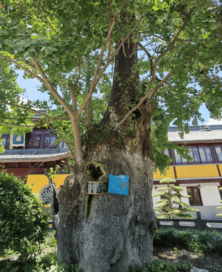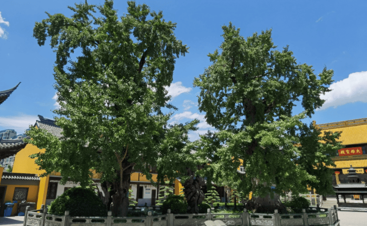 寺前的两棵千年银杏树,是圆通寺最具标志性的景观,被誉为“十样景树”。这两棵银杏树龄已达980余年(2005年经苏州农林专家鉴定),被列入江苏省名木古树名录。其神奇之处在于,树干中竟然共生出榉、朴、榆、槐、柏、枫等多种花果树木的枝叶,形成“一树十景”的奇观。春日里五彩缤纷,秋日则满目金黄,落叶铺地如金色地毯,是绝佳的拍照打卡地。据传,明朝开国功臣常遇春曾在此拴马烧香,古树如今虽已中空,但侧枝茂盛,虬枝盘旋,古香古色。更有意思的是,这两棵古银杏树的根上发孽出18棵小银杏树,与“十八罗汉”数量吻合,此景称为“二九幼株”。