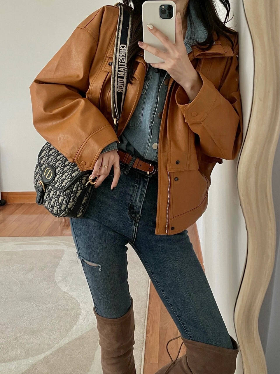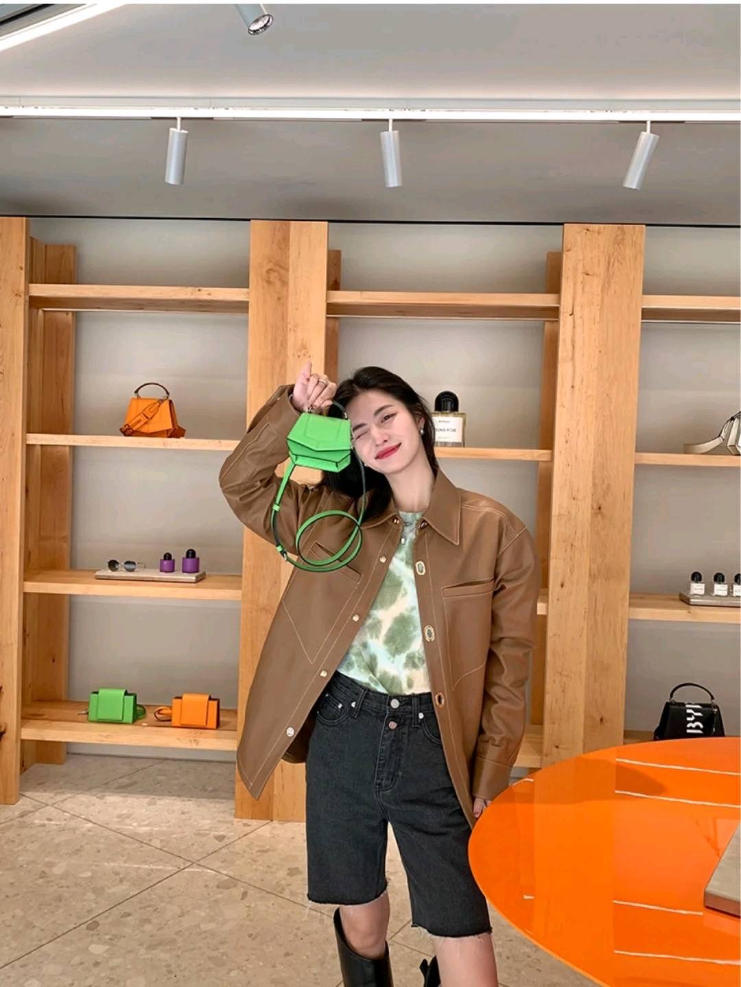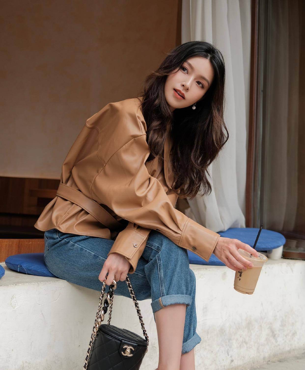 蓝色与棕色的搭配可谓是经典的组合。棕色皮衣搭配牛仔蓝是永不过时的穿搭,兼具复古与休闲感,非常帅气。