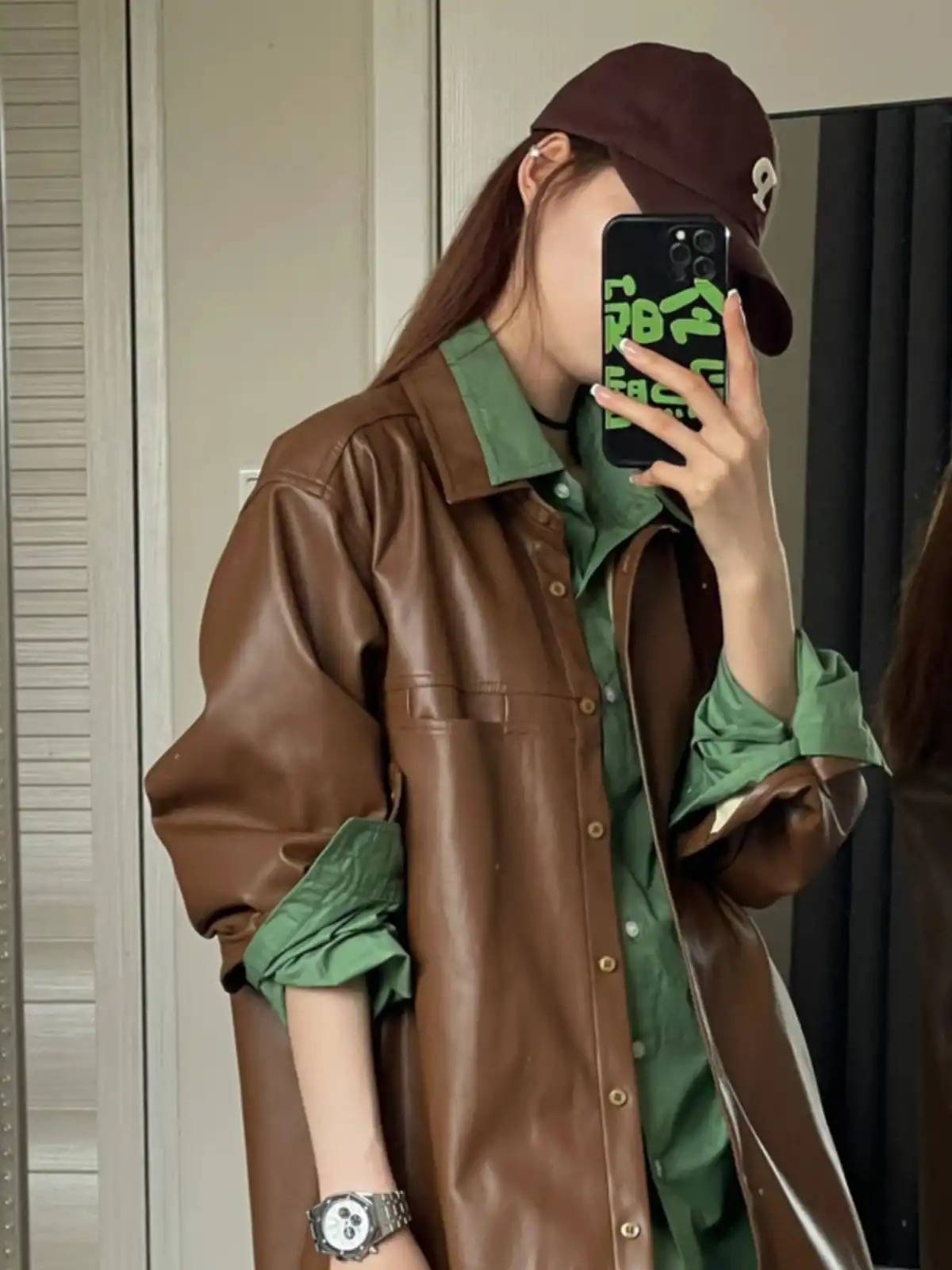 但是,也不是说棕色皮衣就完全不能搭配鲜艳的颜色。如果真的想提亮,可以选择小面积的亮色点缀,如一条亮色的丝巾或包包,或者将这些亮色用于小面积的内搭,并用中性色隔开,如白色、牛仔蓝等。