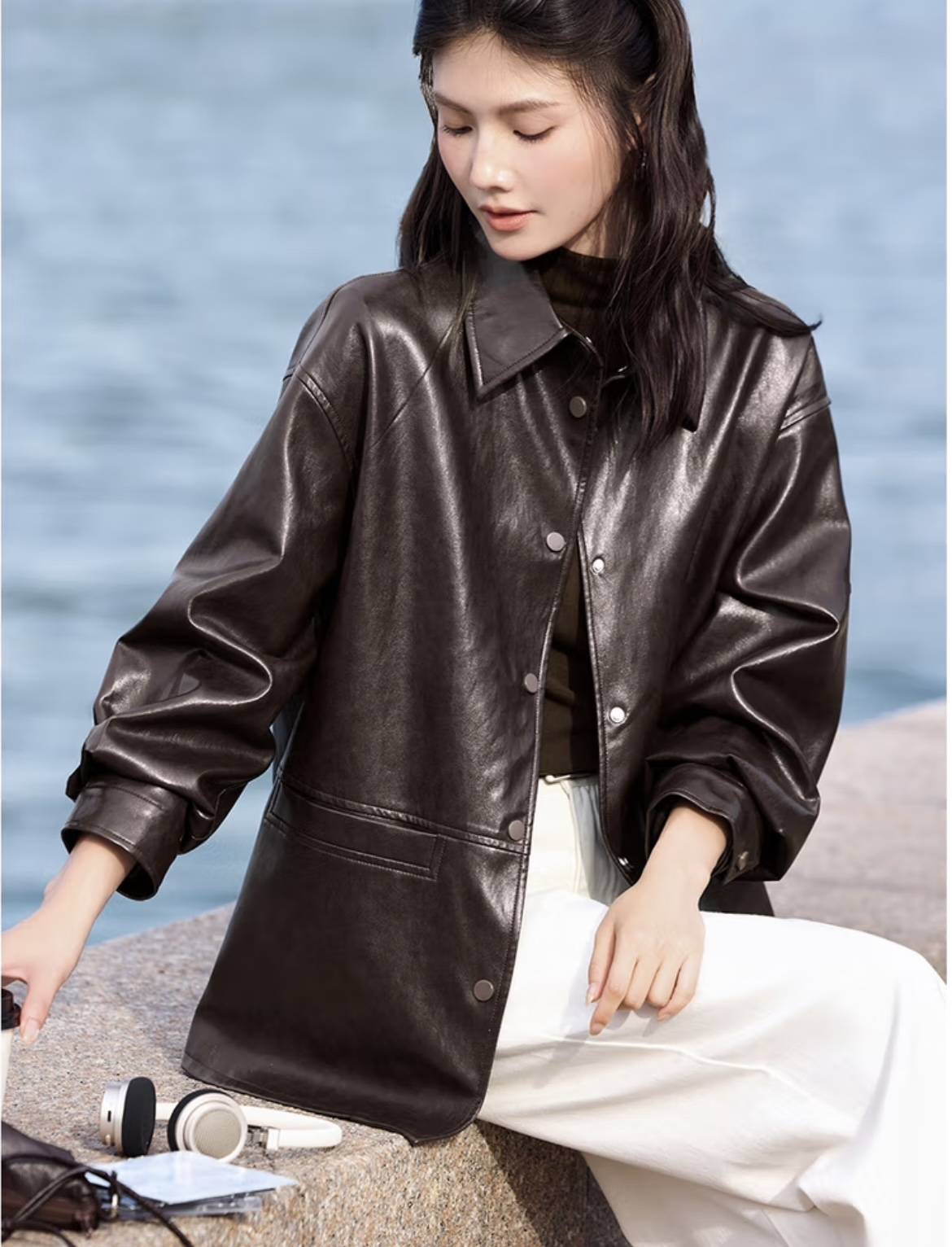 暖调的浅色是棕色皮衣搭配的万能救星,不如奶油白、米色等。它能瞬间提亮整体造型,打破棕色的沉闷,显得干净、利落又高级。
