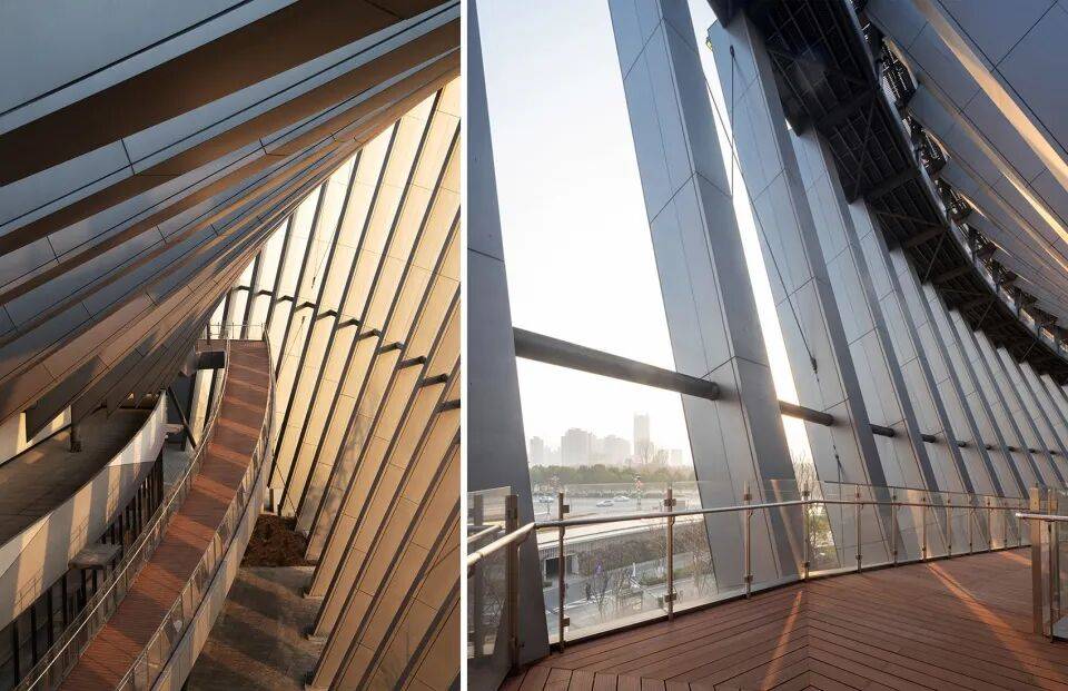 在此基础上,利用莫比乌斯环的结构空腔,打造出两条交织起伏的“空中栈道”——总长度1公里,如同依托建筑而生的“平行空间”。漫步其上,能在不同高度欣赏汉江与城市的景观,两条环线的人流还能在空中交汇、停留;栈道串联起各类室外活动场所,既丰富了“行走与探索”的乐趣,也为商业运营(如临时展览、小型演出)创造了条件。人们感受到的外化形体的“绵延起伏”实则来源于内在行为的“峰回路转”,正所谓“明修栈道,暗渡陈仓。”