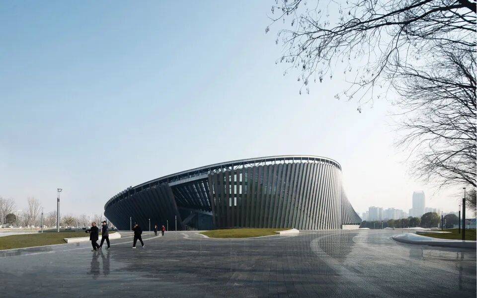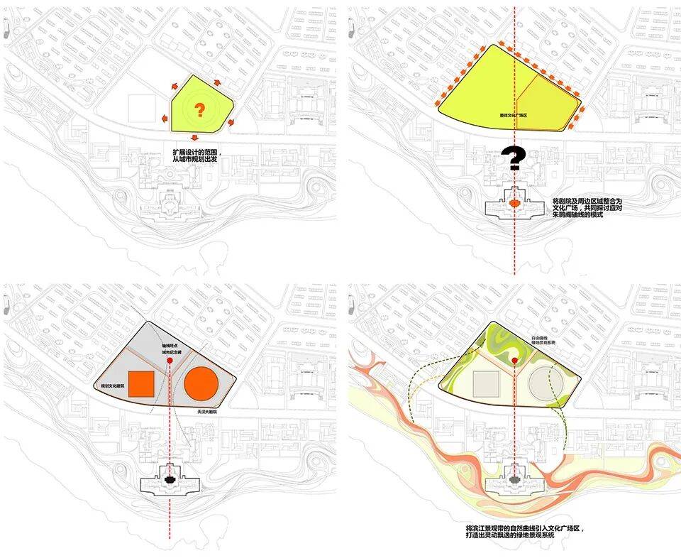 设计团队抓住建筑与自然、人文环境的核心关联:以场地南侧已有的标志性建筑“天汉楼”为空间锚点,顺势拉出一条贯穿南北的城市轴线,将大剧院置于轴线东侧;又因场地坐拥开阔景观,且地处街角节点,遂选定完整的圆形作为建筑形态——如同在新的城市棋盘上落下第一颗棋子,既独立醒目,又与“天汉楼”形成遥相呼应的时空对话。与此同时,设计团队还在轴线西侧规划了另一座文化建筑,轴线北端以标志塔收束,再通过下穿式人行动线,将南侧的文化广场、滨江湿地公园与新建筑群串联起来。这套“以点串线、以线构面”的规划思路,赢得了评审专家的一致认可,也让项目设计权最终落定。