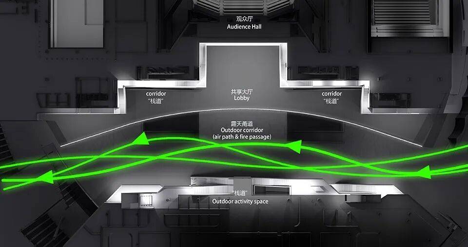 2. 采风中庭:大剧场观众厅两侧设置风庭,利用高差与导流路径形成“天然造风系统”,实现过渡季自然通风。