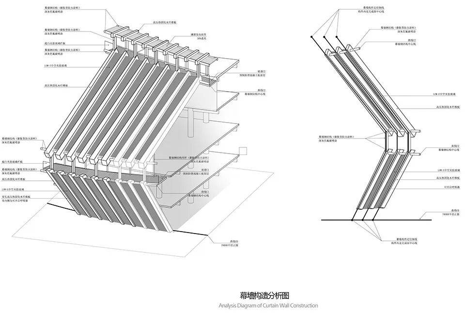在技术实现上,通过Rhino软件对整体造型进行有理化分析,优先保证玻璃单元的尺寸统一,将形态变量消化在实体格构部分——这样既减少了定制化加工的成本,也降低了施工难度。实体格构选用高压热固化木纤维板,这种材料不仅板块分隔灵活、质感多样,且自重轻,能轻松实现外立面的大 尺度完整性。