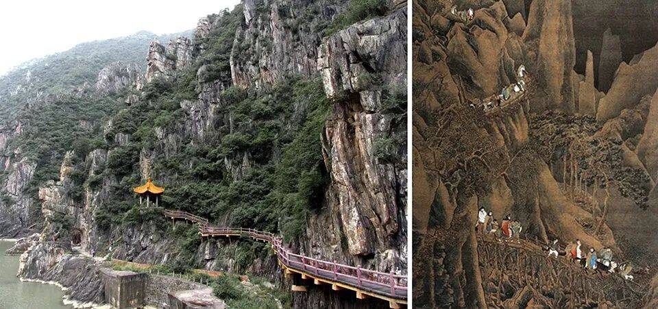 ▲汉中石门栈道及仇英的《剑阁图》©网络
