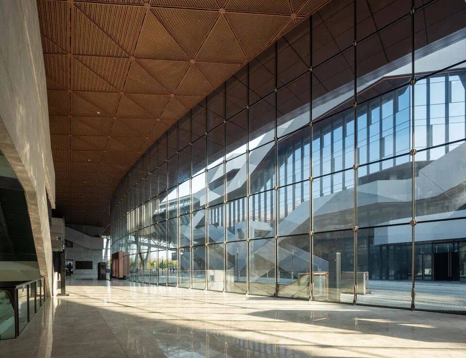 建筑表皮采用“单元格构”设计,连续起伏的条状竖向线条宛如徐徐展开的古代简牍,呼应汉中深厚的汉文化底蕴。通过Rhino软件进行有理化分析,确保玻璃单元尺寸统一,降低成本与施工难度。