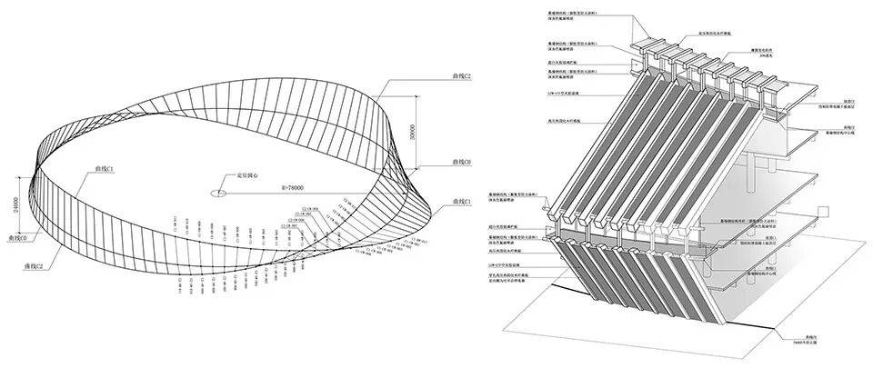 深入研究后发现,两次扭转的莫比乌斯环会呈现“一活一静”的双面形态:南侧面向城市广场,布置青少年活动中心等“活跃功能”,让丰富的形态与热闹的氛围呼应;北侧朝向未来住宅区,安排工人文化宫、老年活动中心等“静态功能”,以沉稳的界面契合静谧的生活节奏。建筑地下整体开挖,中部设会议中心与餐厅厨房,既联通南北两区,又满足各功能的共享需求;莫比乌斯环的两条结构环线自然成面,其交线处形成“露天甬道”——既是进入剧场前的仪式性过渡空间,也是划分功能区块的“隐形边界”。至此,莫比乌斯环不再是单纯的装饰表皮,而是深度参与体量塑造的“结构骨架”。外环之内的建筑实体,则采用正交网格系统,让人员流线与功能布局更清晰,也降低了施工难度;沿外侧设置外廊与公共空间,巧妙消解了“圆形外皮”与“方正内核”的衔接矛盾,既留出通透的“呼吸缝隙”,也增强了建筑的开放性。