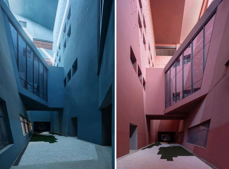 - 外挂回廊:南侧建筑外立面设置贴墙而行的室外回廊,延续栈道意象。
