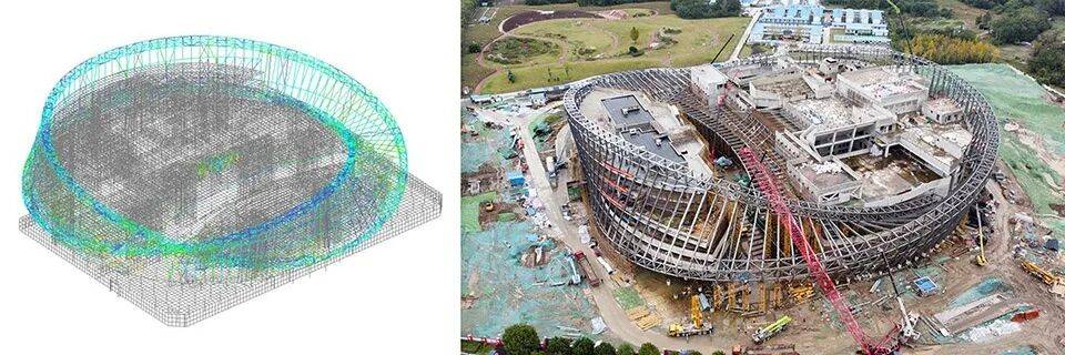 天汉大剧院的莫比乌斯环造型施工难度极高。项目团队创新采用“钢梁滑移安装方案”: