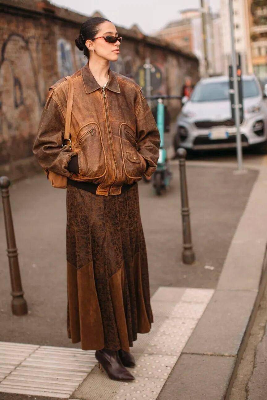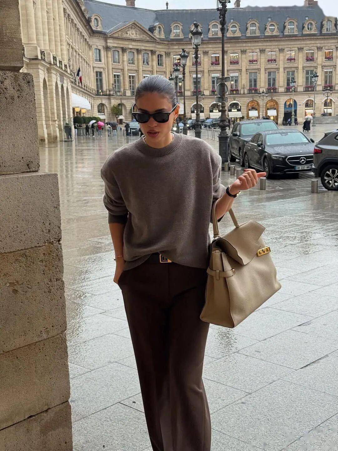 靠肌理差异破单调:哑光羊毛大衣 + 微亮皮革短靴 + 粗糙针织内搭,不同材质的温度碰撞,让棕色系有了呼吸感;