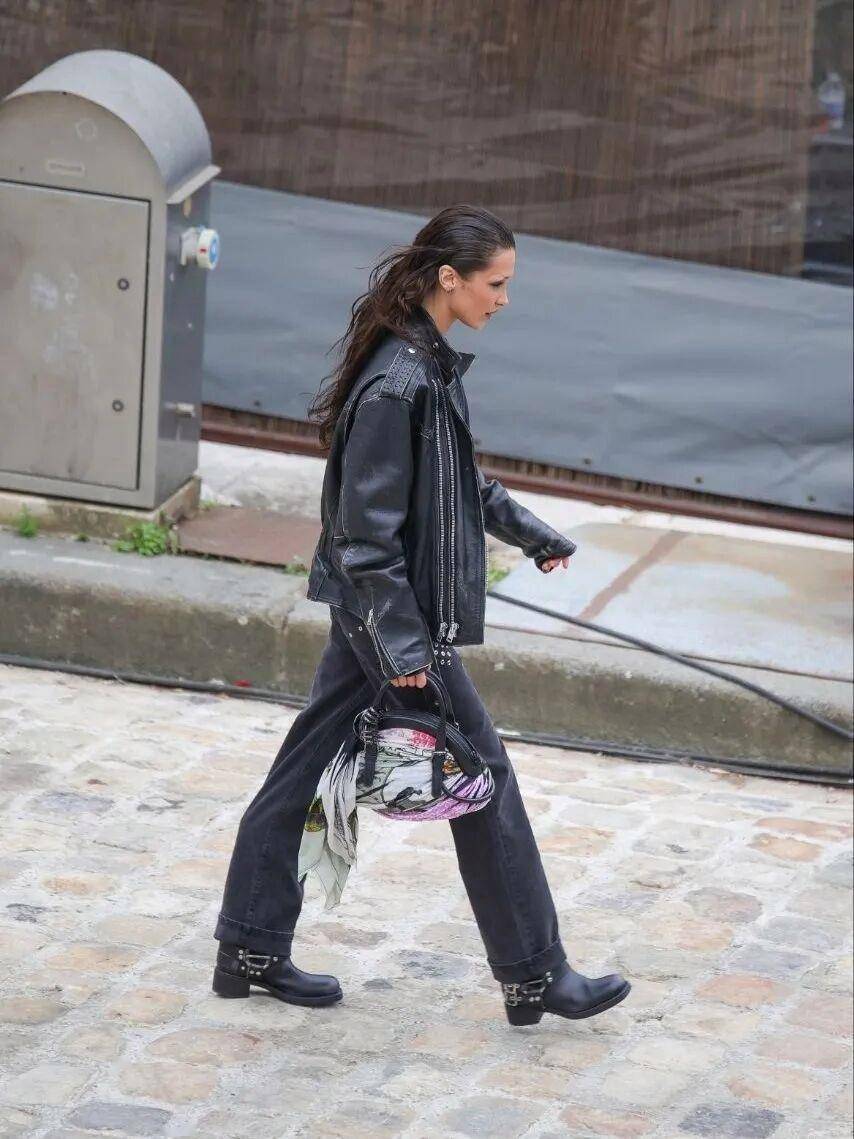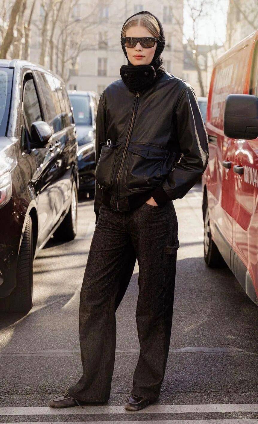 材质碰撞显层次:皮质外套 + 哑光羊毛裤 + 丝质内搭,硬挺与柔软、亮面与雾面的对比,让黑色流动起来,避免压抑;