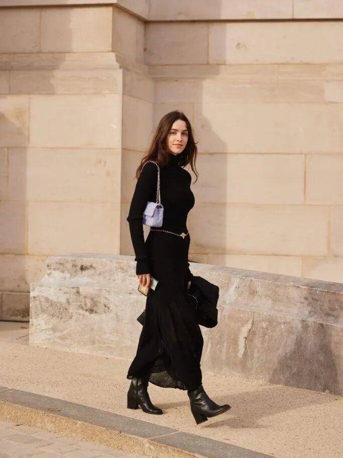 小细节破沉闷:用亮面漆皮包、金属耳环或丝质围巾点缀,瞬间打破黑色的厚重,添一份精致感。