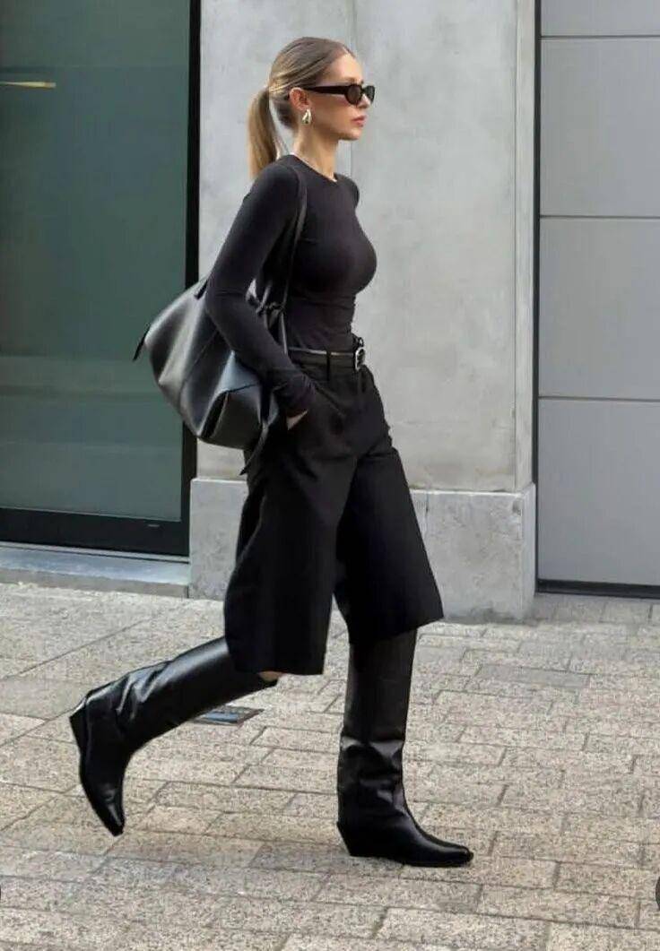 比例把控是关键:“上紧下松”(紧身针织 + 阔腿裤)或 “长外套 + 窄裤”,不让身体被黑色吞没,凸显利落线条;