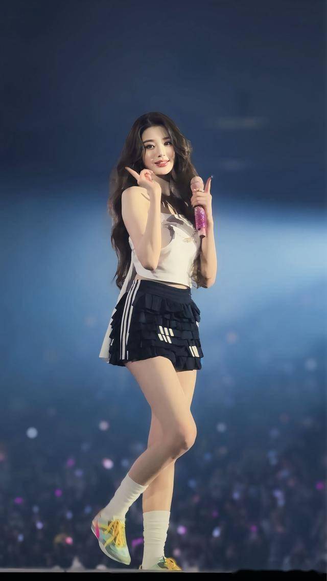 蓬蓬裙对下半身有极佳的修饰作用,尤其适合梨形身材或希望隐藏臀部线条的人群。而IU本身拥有优越的腿型,在蓬蓬裙的衬托下,腿部显得更加修长。黑丝连脚袜则进一步强化了这一效果,其紧致包裹性让腿部线条更显流畅。