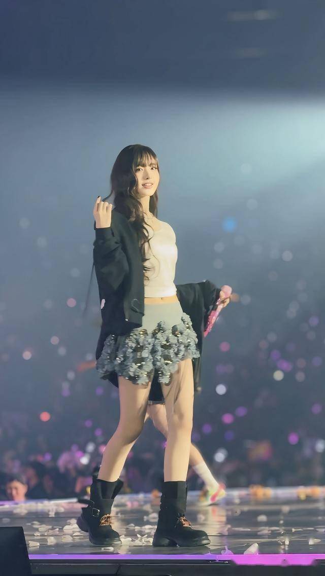 下身搭配的蓝色蓬蓬裙是造型的点睛之笔。明亮的蓝色在黑色蕾丝的映衬下显得格外活泼,打破了整体造型的沉闷感。蓬蓬裙的版型设计巧妙:蓬松的裙摆能够修饰臀部线条,同时在视觉上缩短上身、拉长下身,优化了身材比例。裙摆像一朵盛开的花朵,为整体造型增添了灵动与俏皮,与IU一贯的清新形象相得益彰,却又比以往多了几分成熟韵味。